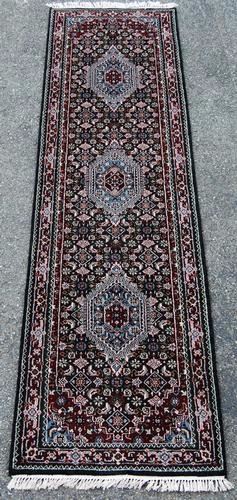 nice looking dark toned hand woven bidjar design runner. size 2.3 x 9.7 feet, made of fine quality lamb's wool pile on cotton foundation, all natural vegetable dye, incorporating a design pattern that replicates traditional persian 'iron rug' bidjar rugs. a beautiful rug that employs darker toned colors.