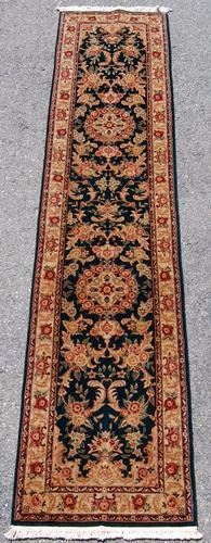 captivating hand woven tabriz design runner w/silk highlights. size 2.3 x 10 feet, made of fine quality lamb's wool/part pure silk pile on cotton foundation, all natural vegetable dye, this beautiful rug incorporates a free flowing floral pattern on a beautiful black background; with a pair of highly detailed medallions and is contrasted beautifully by an intricately done multi layered floral border.please also notice the rare color palette implemented in creating this rug.the silk highlights in this rug also give it an extra layer of beauty and esthetic appeal.hand woven by skilled carpet weavers in tibet.
