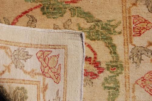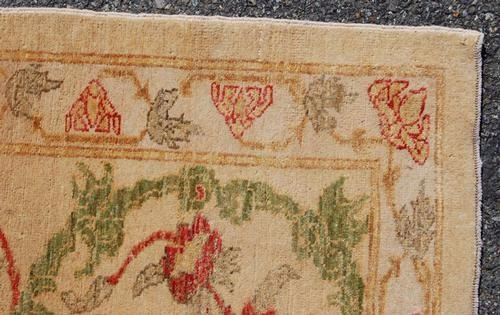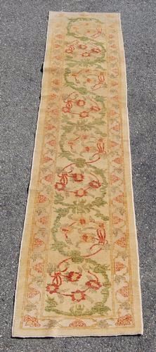 nicely contrasted egyptian runner. size 10.1 x 2.7 feet, made of fine quality lamb's wool pile on cotton foundation, all natural vegetable dye, this beautiful rug incorporates a set of large floral patterns on a ivory background. with very rare and nicely defined colors, and encapsulated by an intricately done floral border. hand woven in egypt.