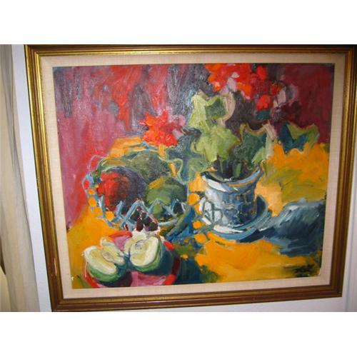 signed contemporary and vibrant oil on canvas with its original frame. measures 20x24 inches. the green apples looks delicious. what an accent for the dinning room! it brings appetite to the table. the frame and the painting are in excellent condition. normal wear and tear. it is just beautiful! great accent for the wall!