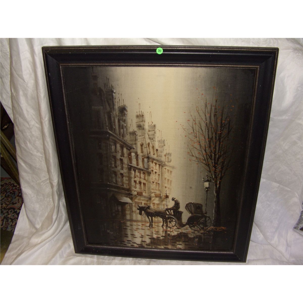oil painting on canvas of carriage & rider in city signed Monica? 34 1/4 x 22 1/2 art 29 1/2 x23 1/2
