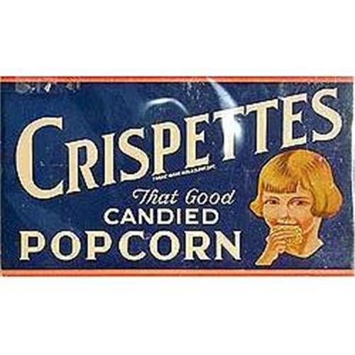 CRISPETTES CANDIED POPCORN SIGN - 1920?s, 8? x 14?, cardboard sign, cute girl eating candied popcorn