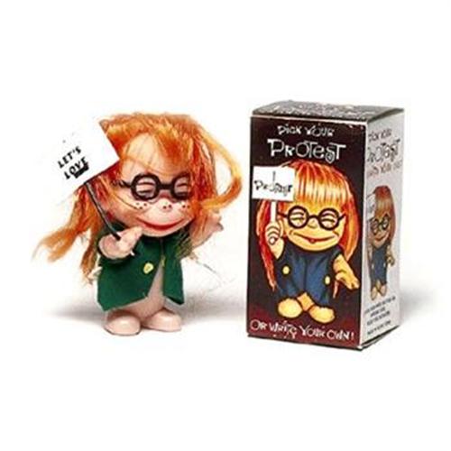 PROTEST DOLL, in original box, includes an assortment of protest signs for the doll to hold, Made in Hong Kong, 1960?s, 4 1/2 inches tall.