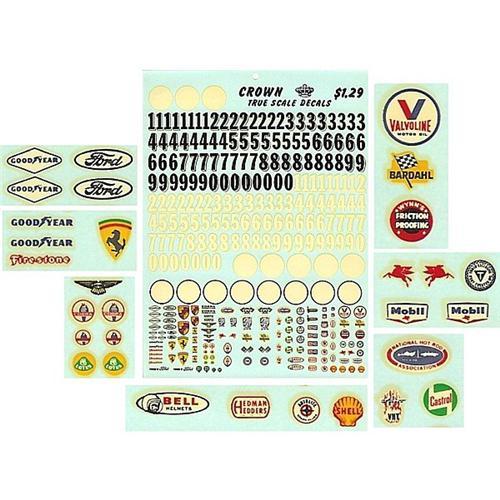 Full sheet of scale model water dip decals, includes over 125 very tiny gasoline, automobiles and parts decals, including Esso, Mobil, Shell, Porsche, Ford, Cobra, Jaguar, Mazerati, Champion, Valvoline, Bell Helmets, Castrol, Goodyear, Firestone, etc.(some have enlarged here to show greater detail). The full sheet is shown in the center photo and measures 8-1/2" x 11-1/2". Back shows manufacturer to be "Morse Decals, Los Angeles 21, Calif. Telephone MAdison 7-8291."