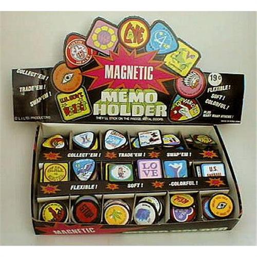 MAGNETIC MEMO HOLDERS, vinyl puffy refrigerator magnets with various 1960?s themes - love, peace, silly sayings, space exploration, automobiles, motorcycles, astrology, etc., in original pop-up display box of approximately 144 pieces, made in Hong Kong, each measures roughly 1 1/4?.