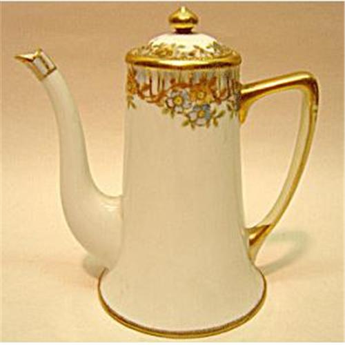 Nippon hand painted individual tea pot, decorated with sylized flower blossoms and highlighted in gold moriage, 6.25"h, marked with the red "Hand Painted Nippon". Excellent condition. <BR>