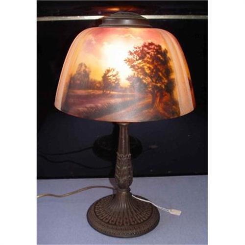 ****NOTE: Email for additional and larger images. </td></tr><tr> <td> </td></tr><tr> <td>Reference #: LT_164</td></tr><tr><td>Condition:J-shaped crack to the top of the glass near heat cap, otherwise excellent working condition.</td></tr><tr><td>Year:Circa 1920</td></tr><tr><td>Height:16.75 inches</td></tr><tr><td>Width:10 inch (shade diameter)</td></tr><tr><td>Title:old Pittsburgh Reverse Glass Boudoir lamp</td></tr><tr><td>Location:Long Island, NY</td></tr></table>