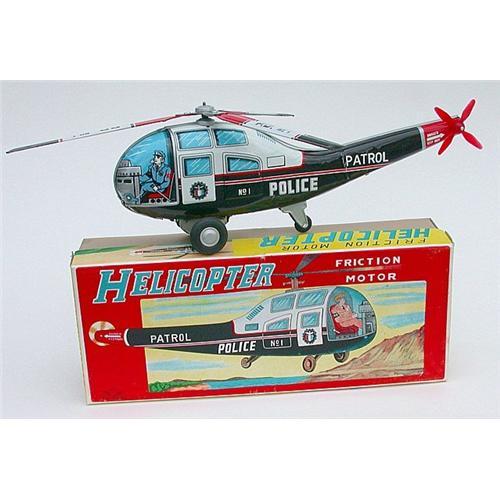 POLICE PATROL FRICTION MOTOR TIN LITHOGRAPHED HELICOPTER IN ORIGINAL BOX, Made in Japan, circa 1950s, large item measuring 13? long and 4-1/2? tall, both toy and box in excellent condition (with some very minor factory scratches on body of helicopter).