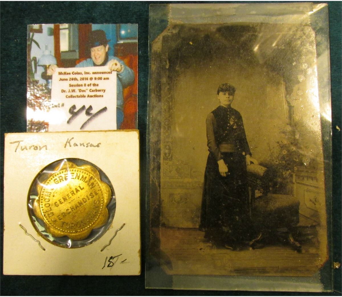 old Tin Type of an 1800 era Woman; & "Bloom & Greenman/General/Merchandise/Turon, Kans.", "Good For/