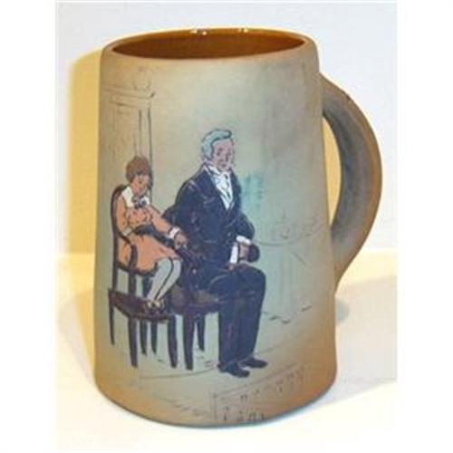 Weller Dickensware Domey & Son mug, incised and painted design, 5.5"h, marked "Weller Dickensware" excellent condition, there is sticker residue on backside, free from any chips, cracks or repairs. <BR>