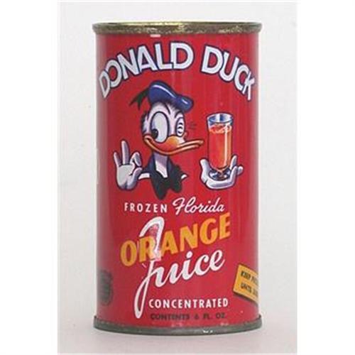 6 oz. empty tin can for Donald Duck Frozen Florida Concentrated Orange Juice, marked "©W.D.P" and "Accepted Council on Foods and Nutrition American Medical Association," 4 inches tall, opened at one end, beautiful litho of classic Donald winking and holding glass of OJ, circa 1942.