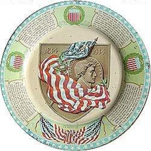 C. D. KENNY TIN ART PLATE -- 1914, 9½? diameter, pictures Francis Scott Key & the American flag plus shields
