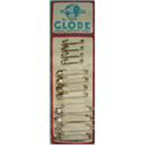 1930's Cards Globe Safety Pins, 12 assorted size safety pins on the card, says The Globe Steel Safety Pins, Made in Czechoslovaki, about 7" tall, some have minor rust..