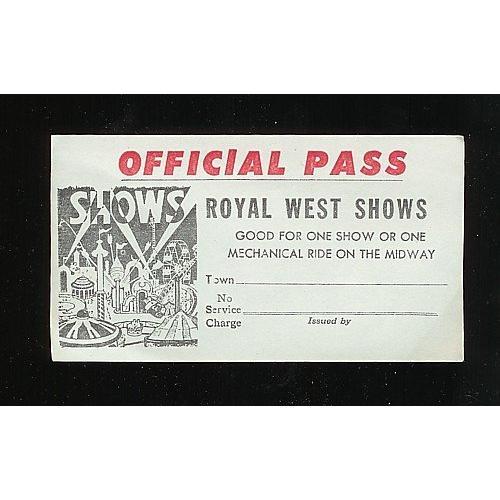 Paper "OFFICIAL PASS" from Royal West Shows "GOOD FOR ONE SHOW OR MECHANICAL RIDE ON THE MIDWAY," measures 5" long, 1950s.