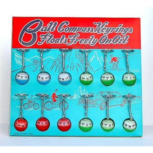 BALL COMPASS KEY RINGS DISPLAY, 12 floating ball compass key chains in assorted colors inset into original die-cut standee display measuring 9? X 10?, made in Hong Kong, 1950s.