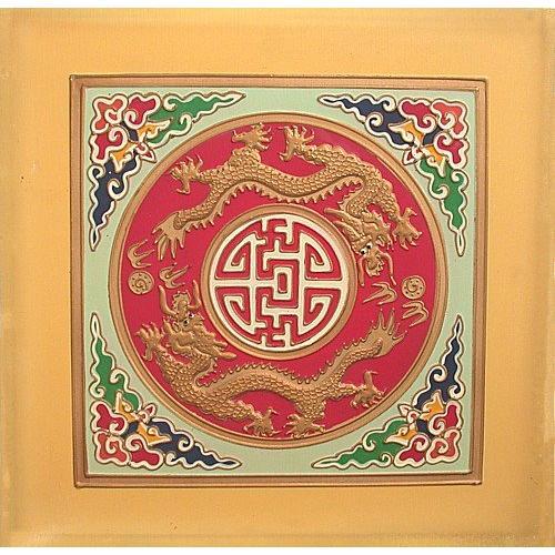 Wooden ceiling panel with fantastic Chinese motif applied in bas relief, measures 18" square, 1930s. These have some very minor edge discoloration (as shown) as a result of decades of use in a now defunct famous Los Angeles Chinese restaurant.<BR><BR>