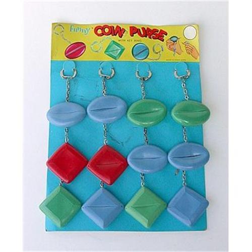 "FUNNY' COIN PURSE KEY CHAIN DISPLAY, with a dozen rubber squeezable coin pouches on display card measuring 8-1/2" x 12", made in Hong Kong, 1950s - 1960s.