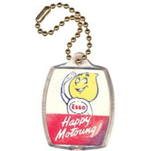 ESSO OIL DROP KEYCHAIN, advertising promotional key chain with lenticular animation: the character waves and wishes ?Happy Motoring.? Reverse side reads ?Compliments of your ESSO DEALER,? 1950s.