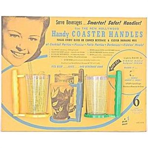"The New Hollywood Handy COASTER HANDLES" on original diplay, heavy cardboard standee with two handy coaster handles, measures 18" wide x 14" tall. (Please note: color of handles shipped may differ from color shown; glasses NOT included.) Quenesstial 1950s kitsch!