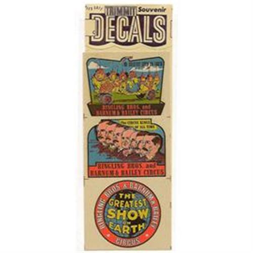 RINGLING BROS. & BARNUM & BAILEY CIRCUS DECAL SET (Style 1), package of 3 different colorful decals: circus wagon, faces of founders, and round logo, package measures 11-1/4? x 4-1/2?, manufactured by Impko, 1950s.