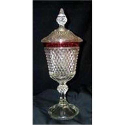 Ruby Flash Diamond Point Candy Dish measures 14" tall. Very Nice condition, year unknown ... obtained at an estate sale