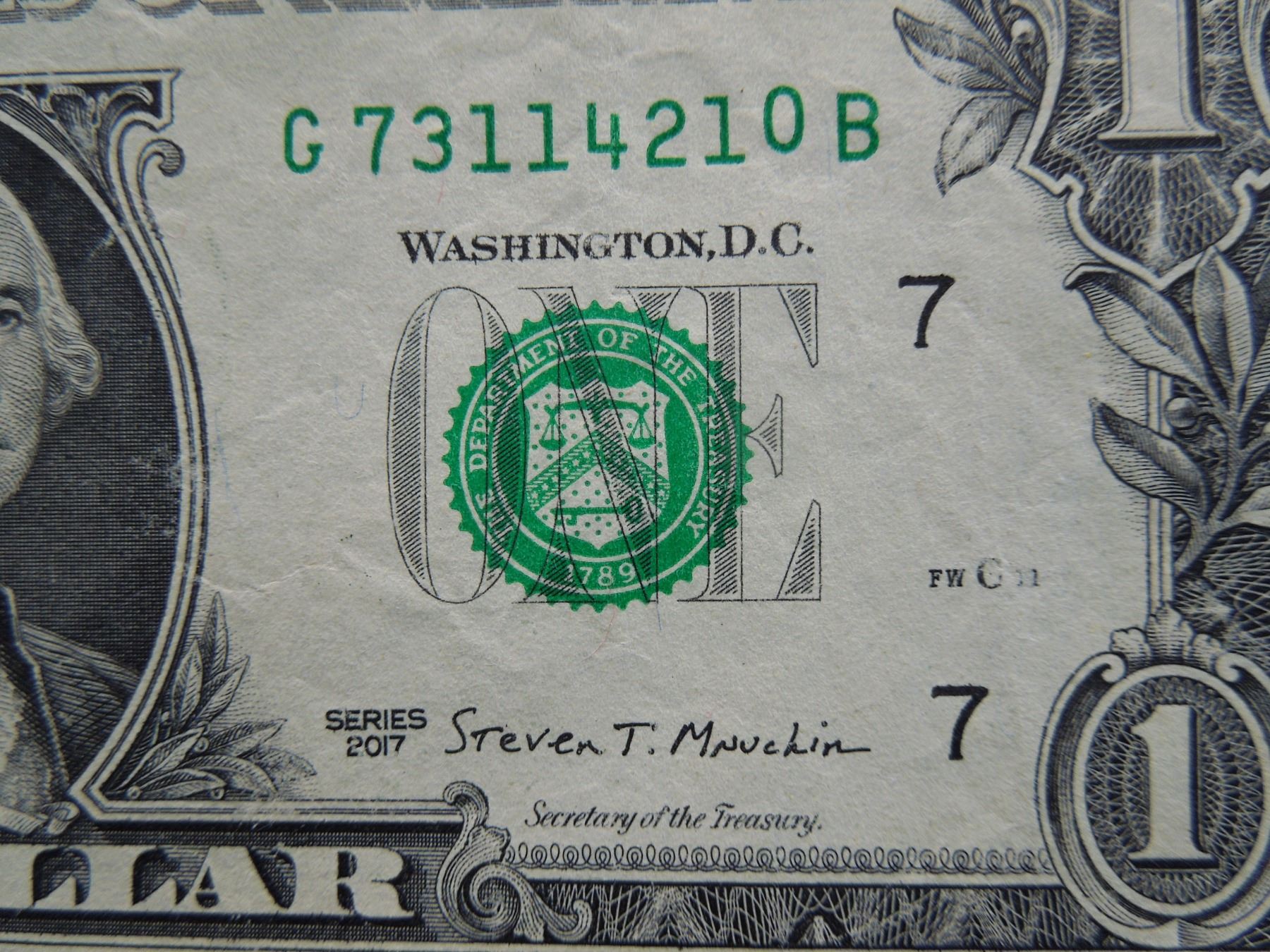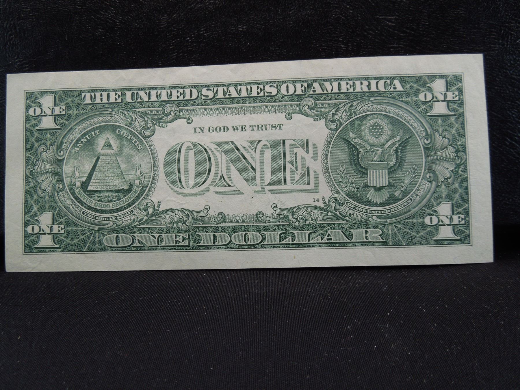 one dollar error bank note with a stack digit error. The o in the serial number is raised higher than the other number