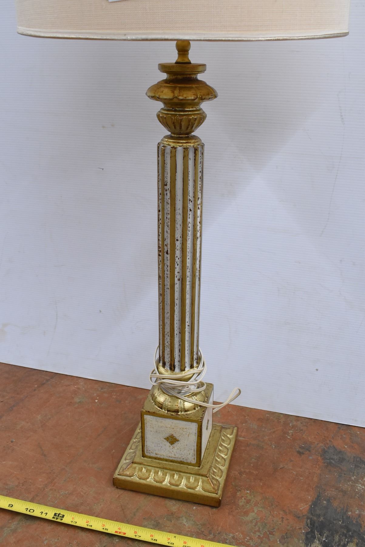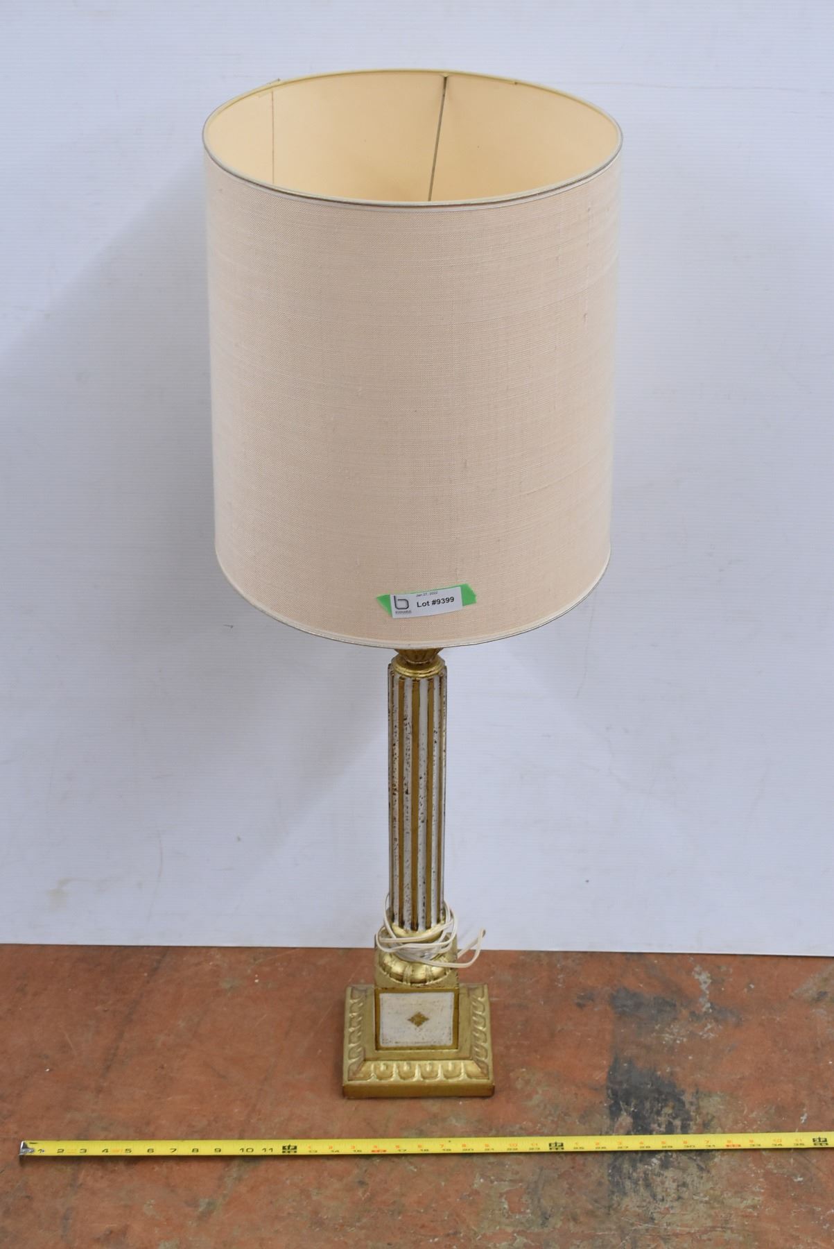 *ornate looking floor lamp (plaster?) with cloth shade - 44" tall to top of shade - working