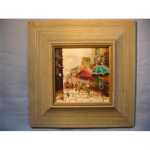 Antonio De Vity Unique outstanding 20th Century Oil on Tile " Street of Paris scene" signed lower right A. De Vity. Vity de Antonio. This painting represent a wonderful scene of street of Paris with magnificent colors such as red, vibrant green umbrella, people, windows, magnificent brown ground and i guess the restaurant. this is a unique art work and i have not seen anything so magnificent. It is also included a certificate in the back. the painting including original light wood frame with light gold trim and is in square shape and 12x12 inches. the tile 6x6 inches square. normal wear and tear.