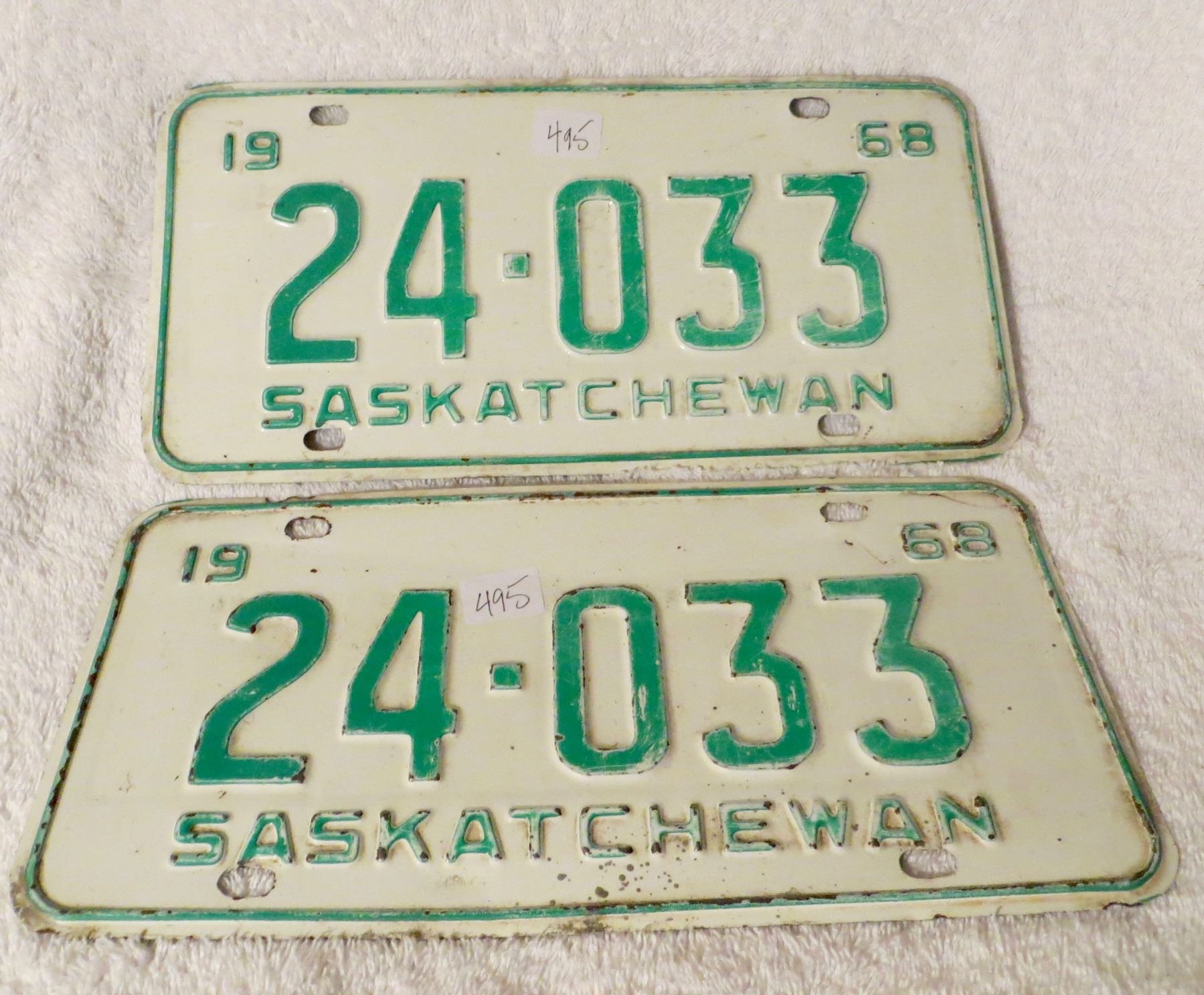 pair of 1968 Saskatchewan license plates - low numbers - 24-033