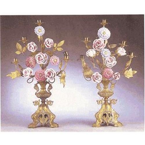 a pair of Renaissance Revival blue enamel , gilt brass and polychromed porcelain five-light candelabra late 19 century . issuing flower and leaves on an urnform standard .