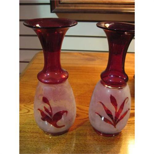 Matching pair of clear glass bohemian style vases with cranberry colored painting of leaves as design. They are in perfect condtion and match.