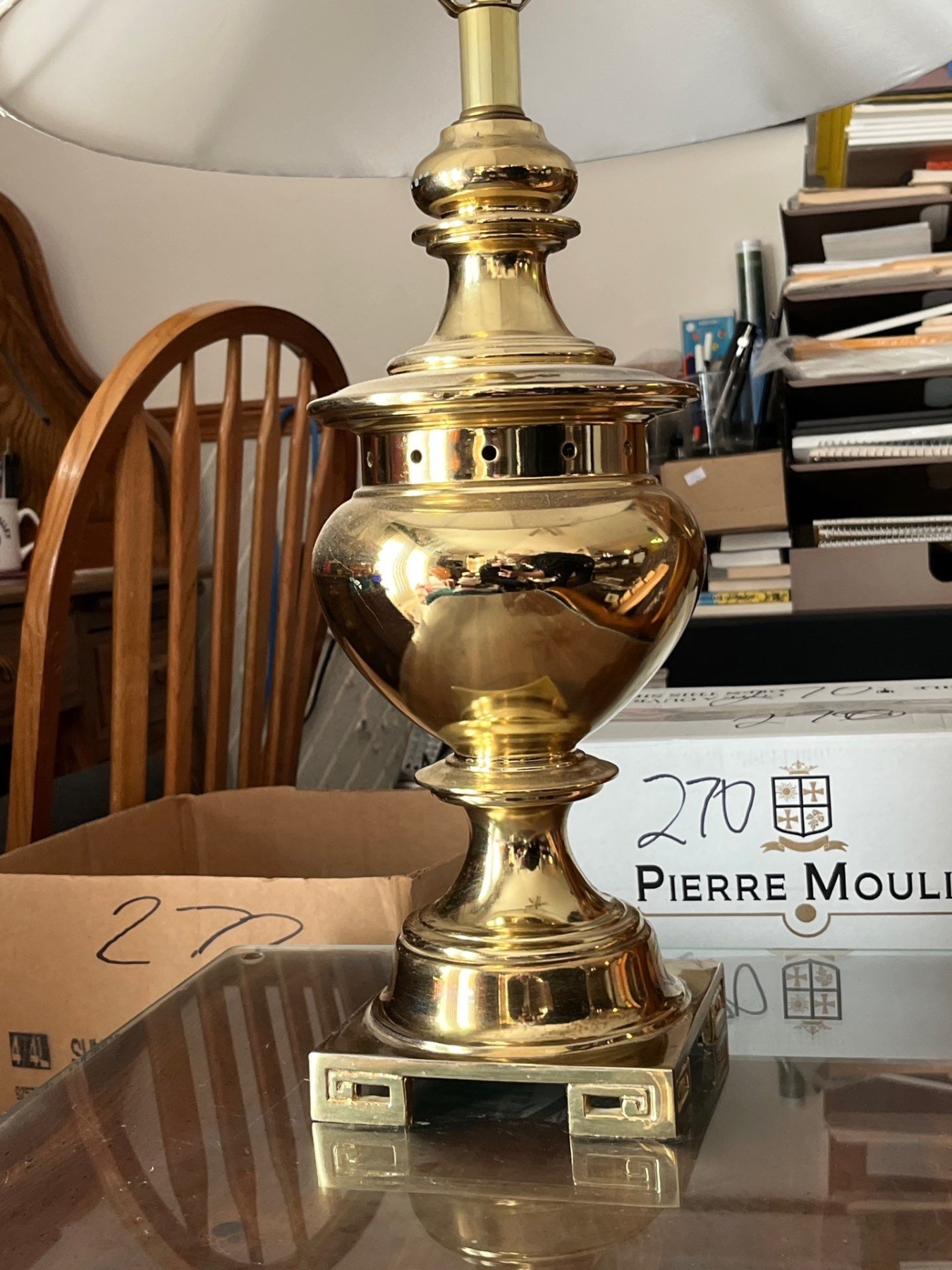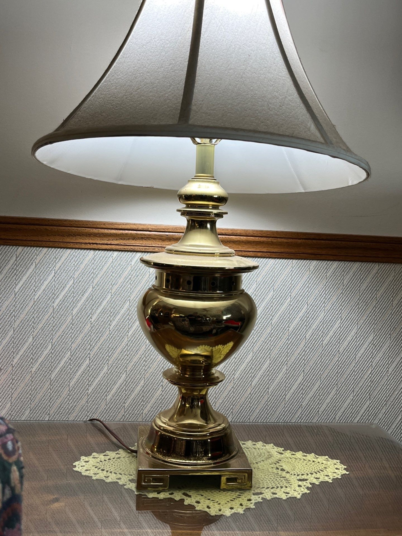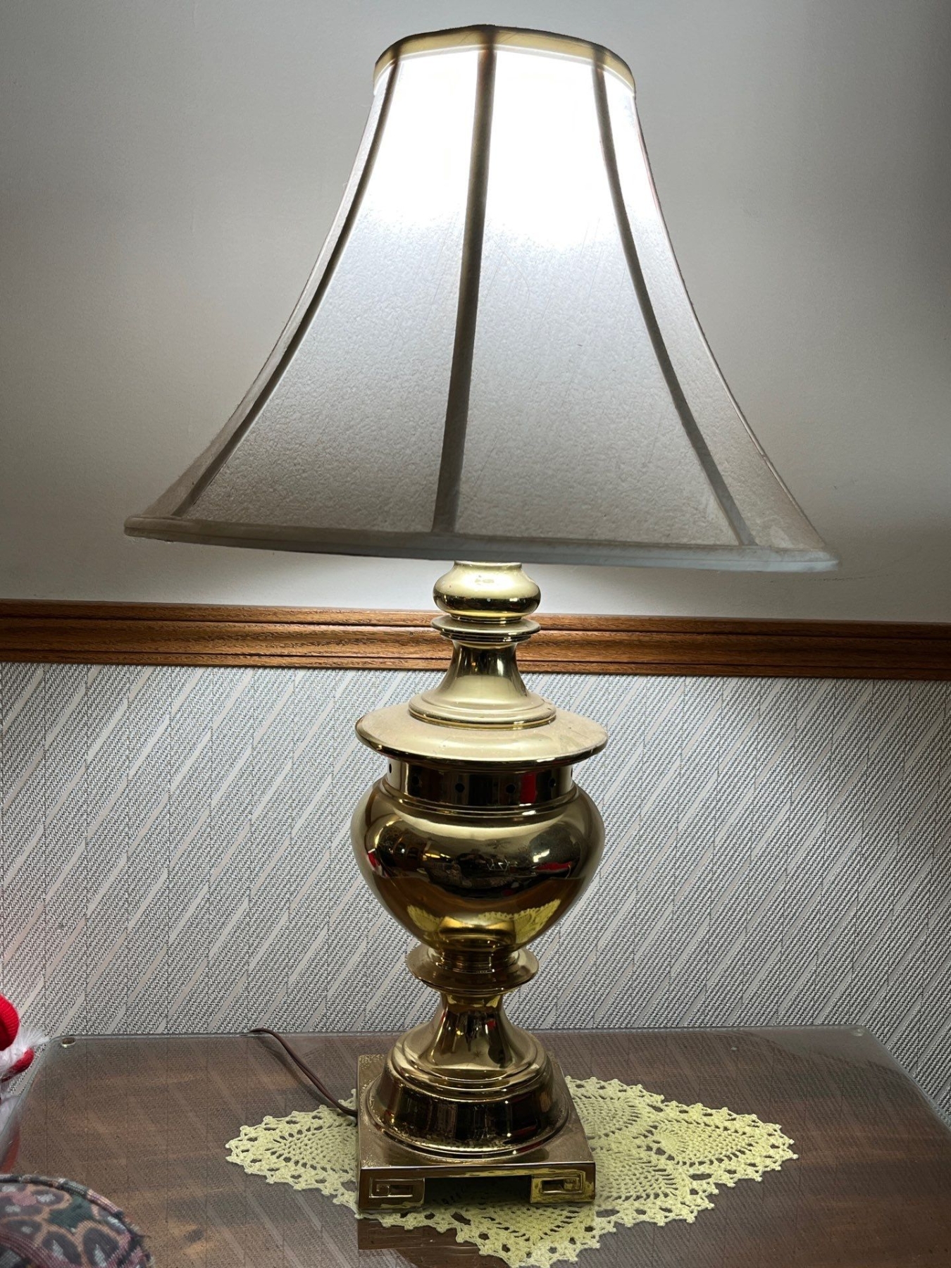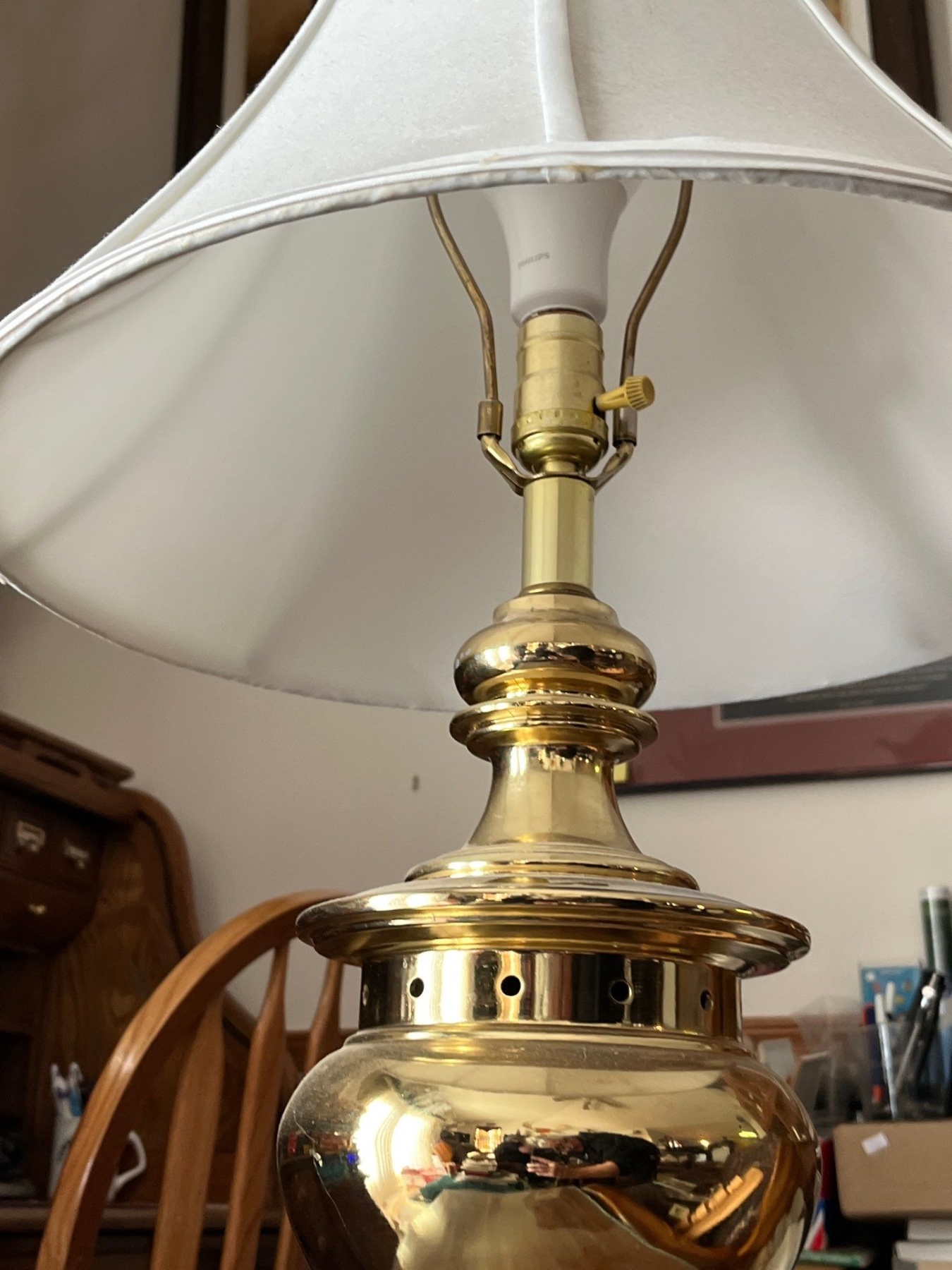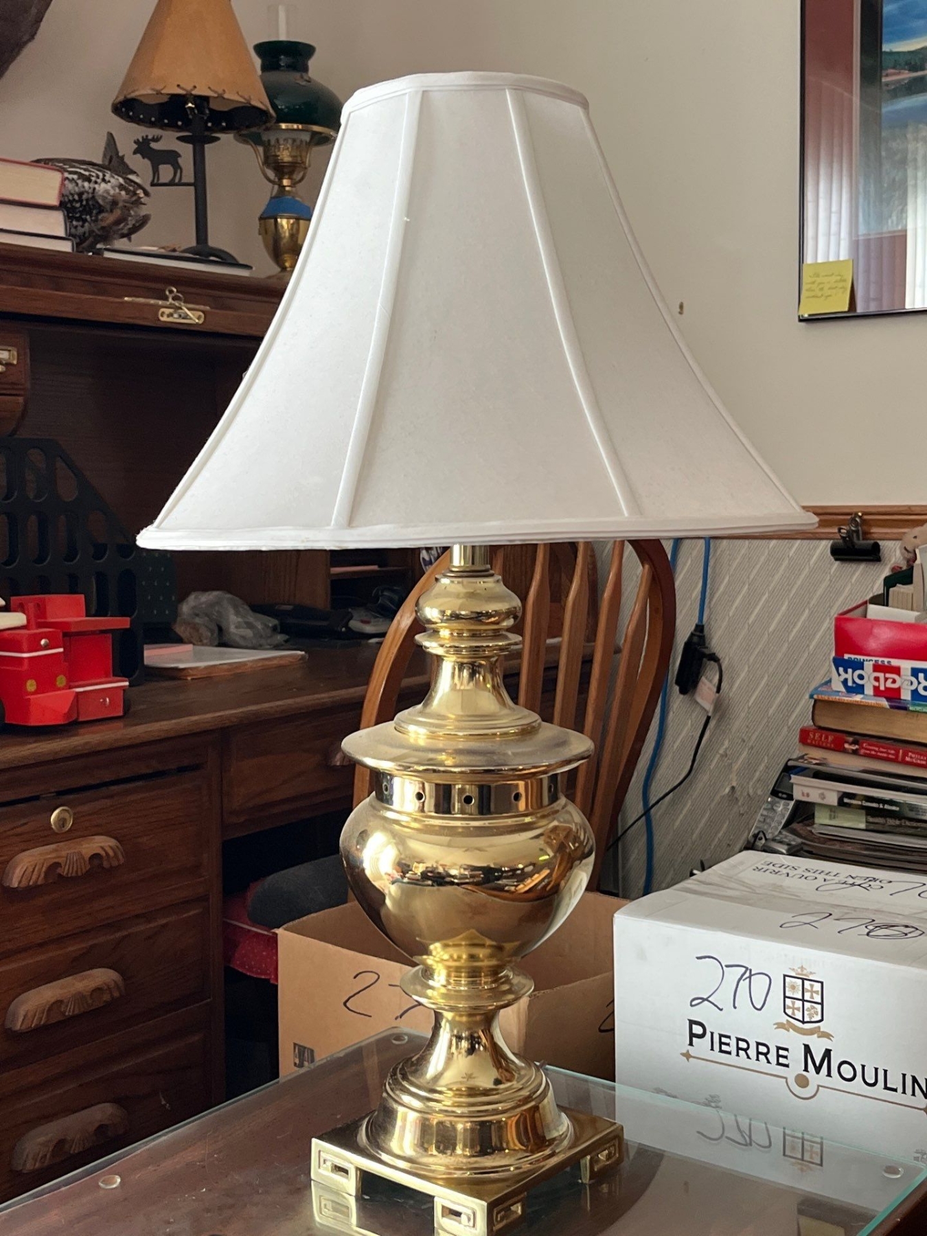 pair of matching brass lamps with nice white shades .