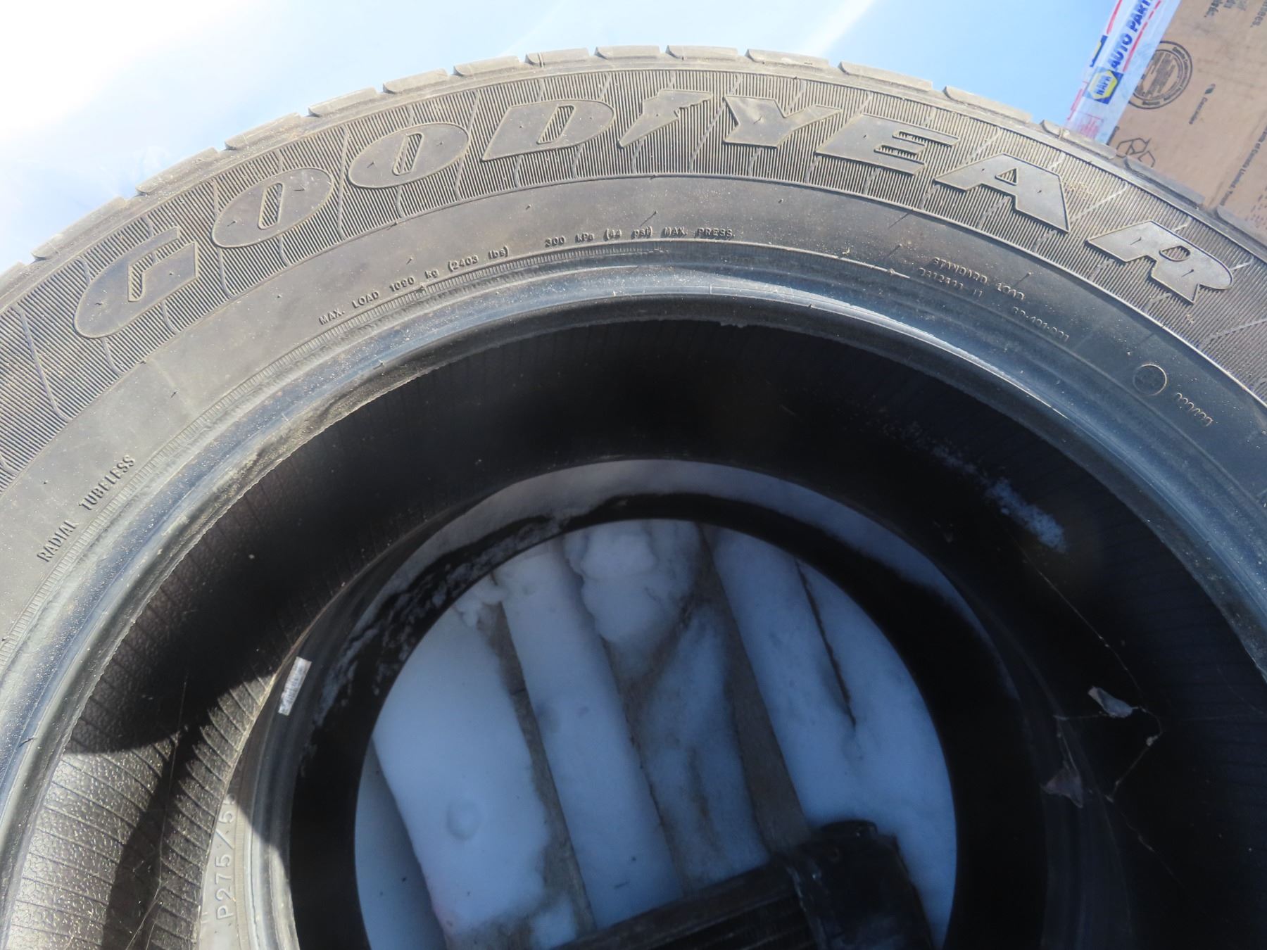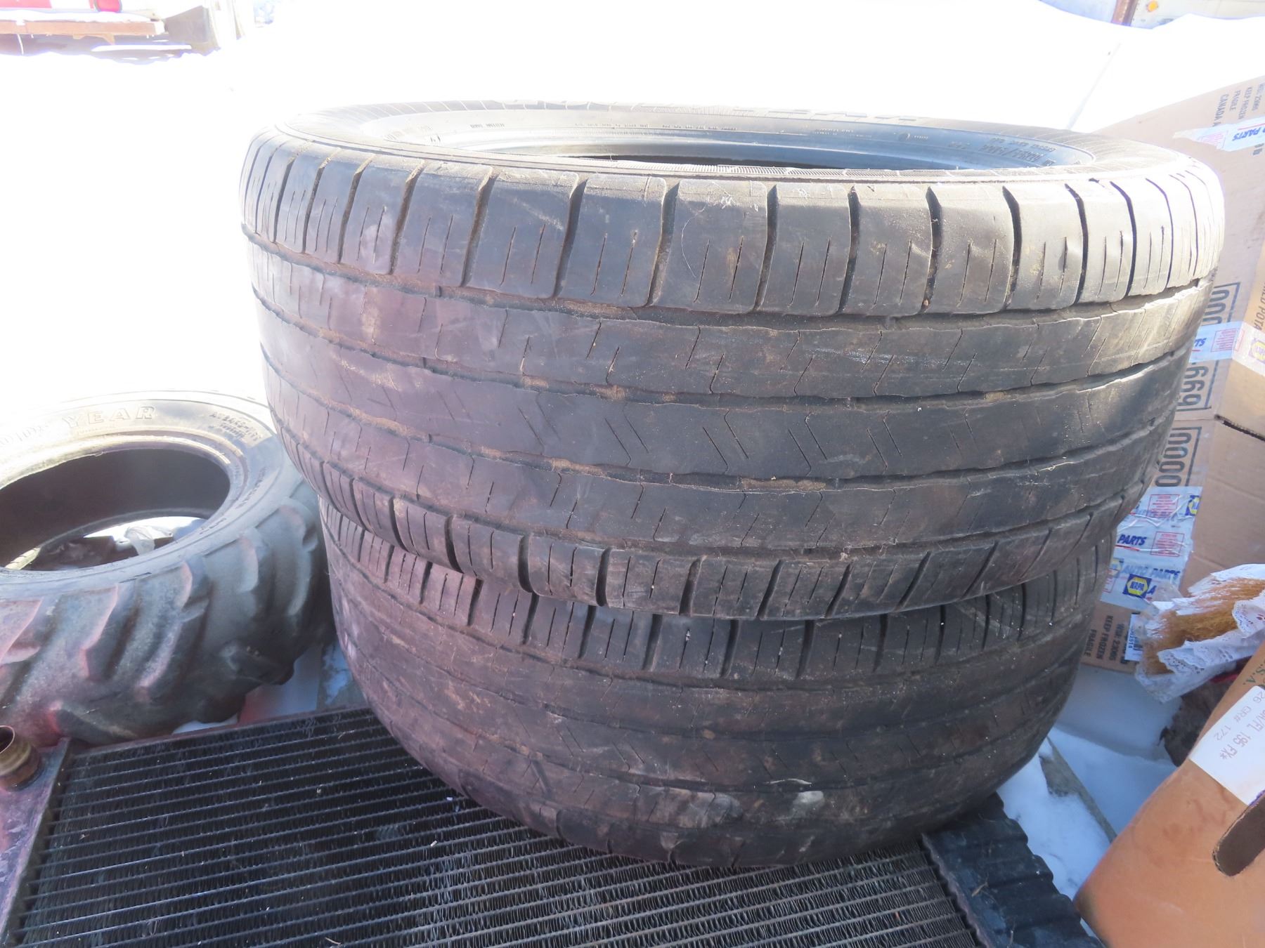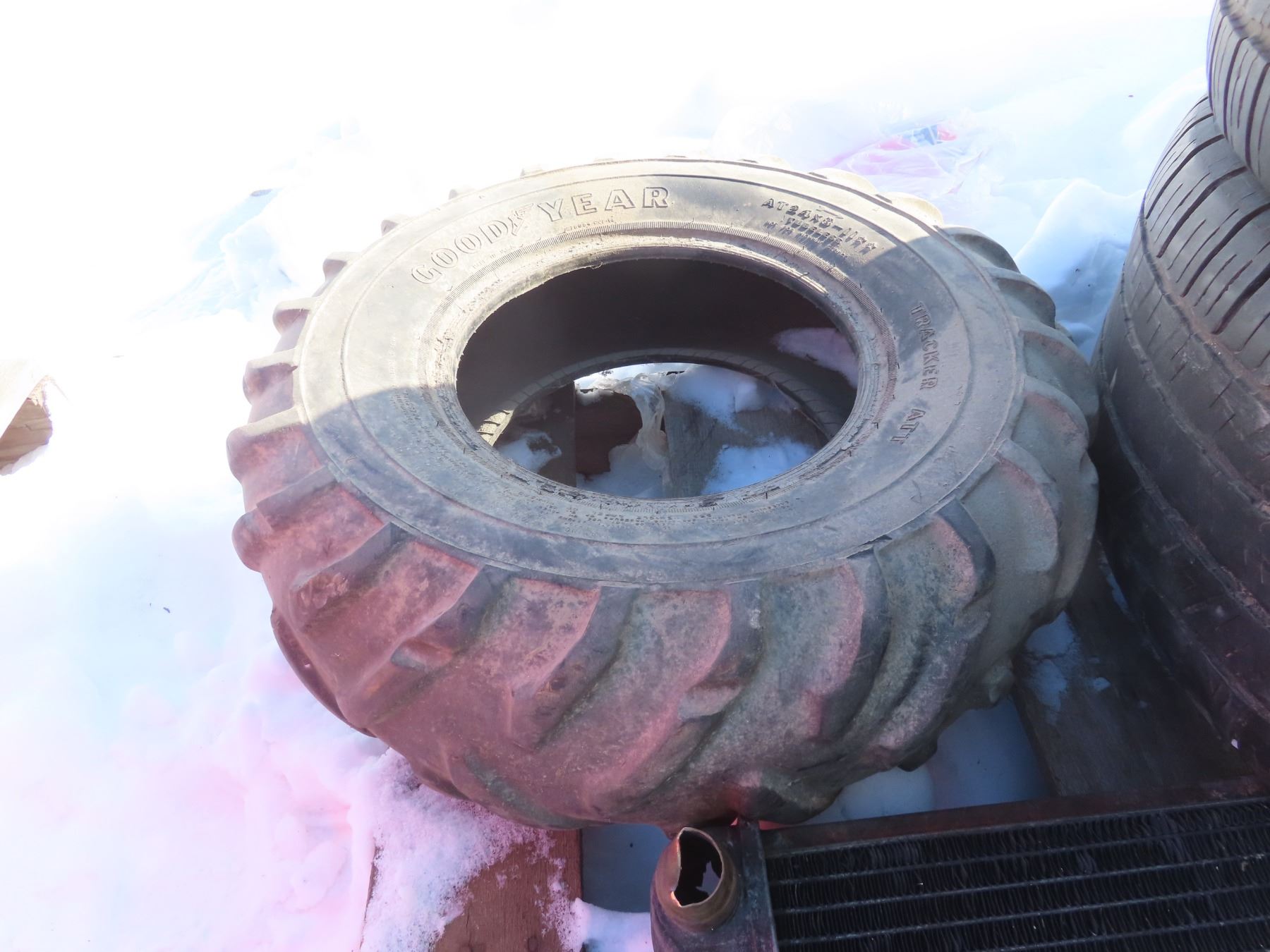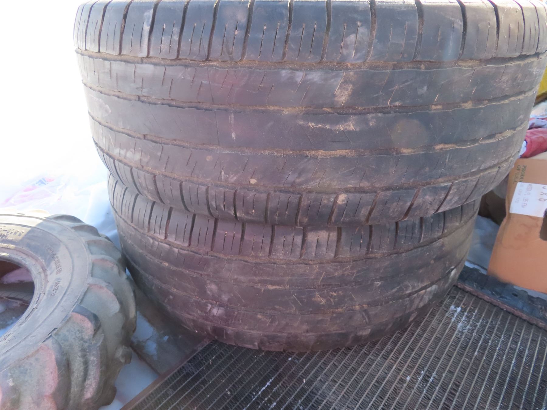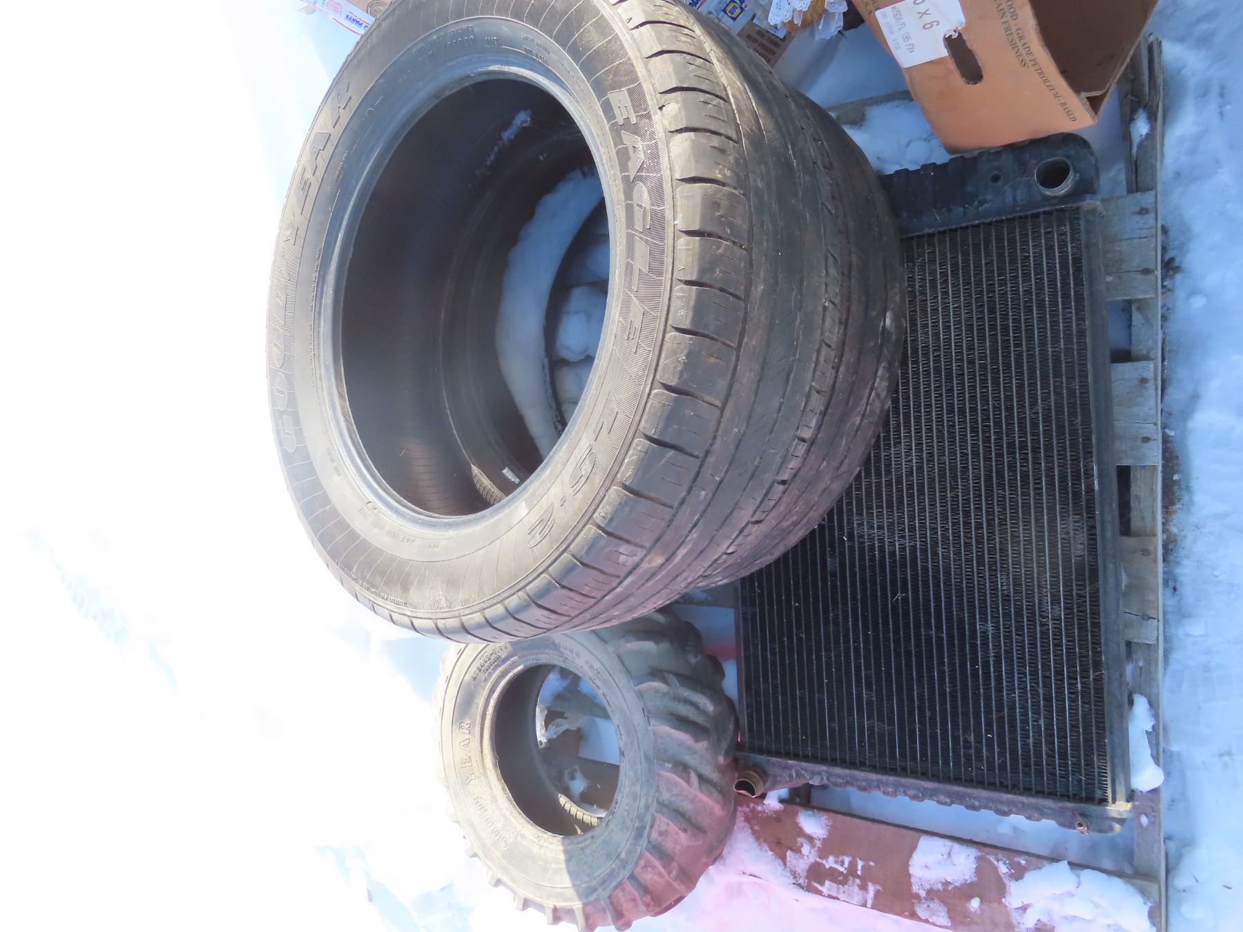 pallet with two matching 275-55-R20 one quad tire 24x8-11 and a radiator
