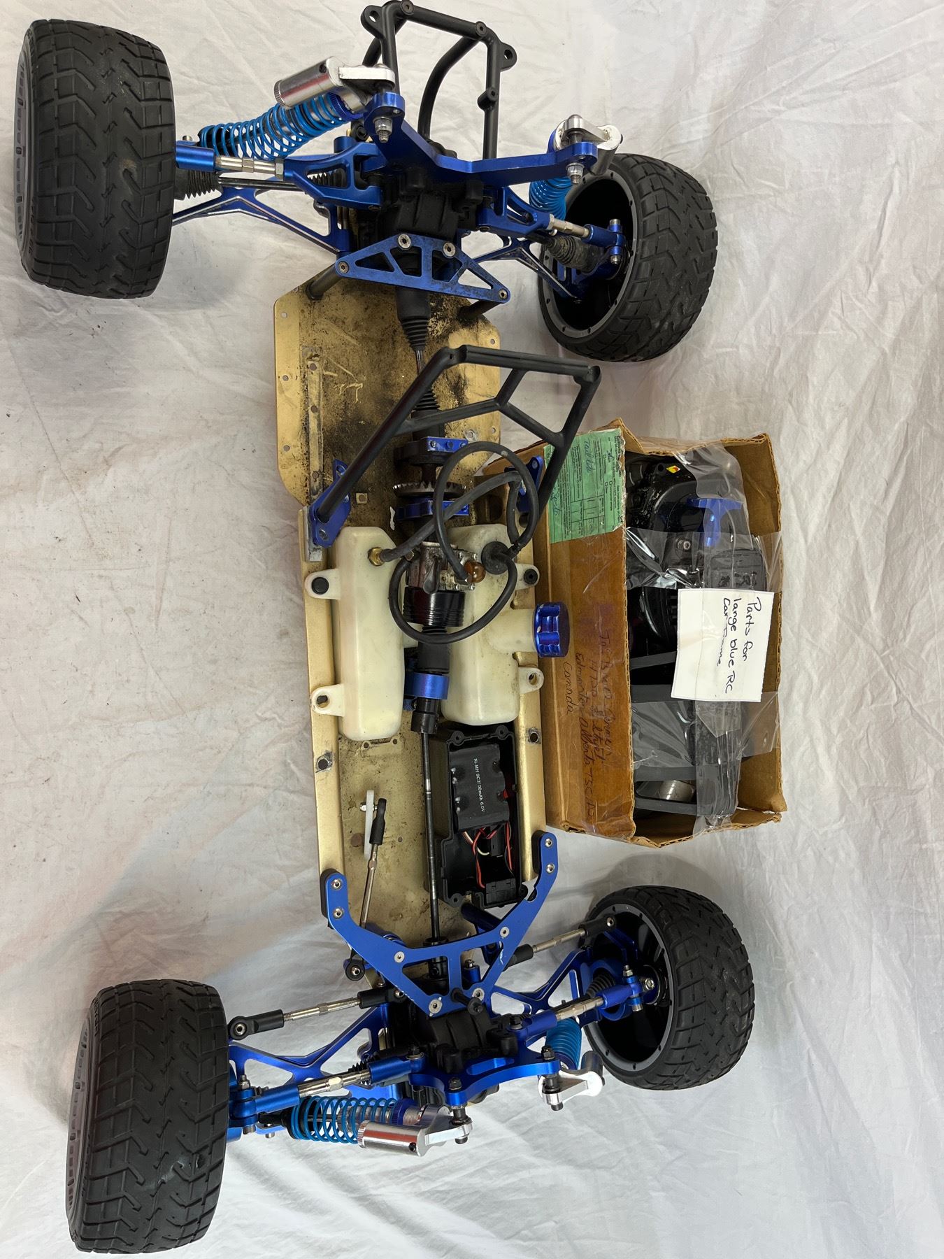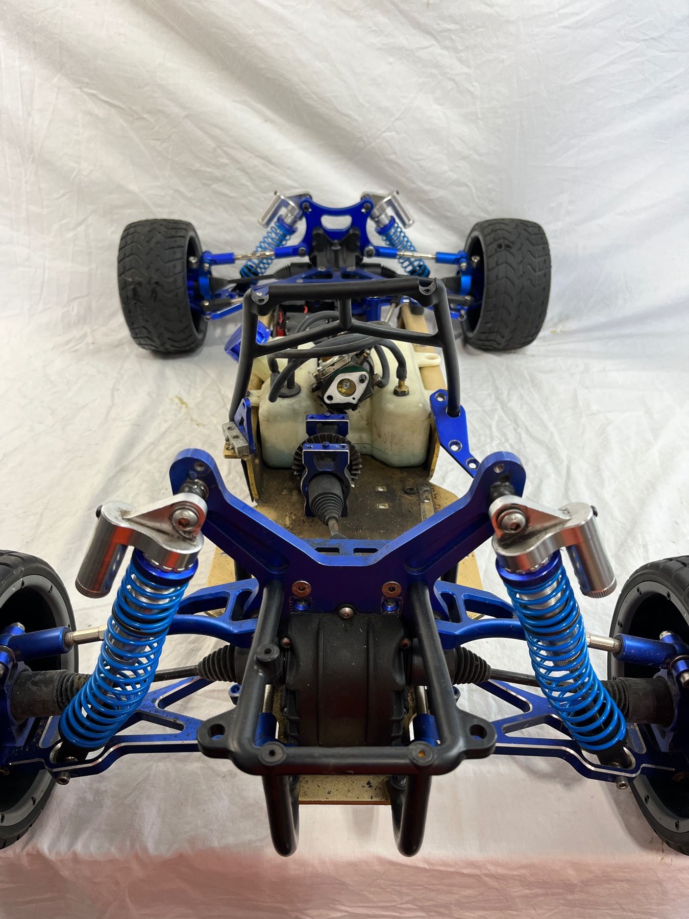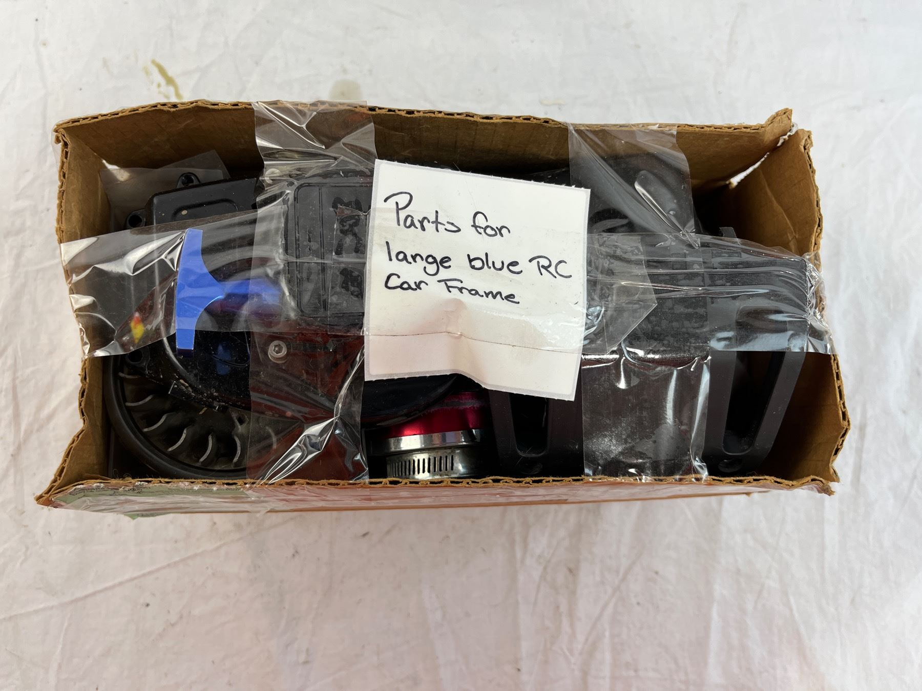 Large Gasoline powered RC Car measuring 32" long and 20" wide. Comes with various parts and components in box.