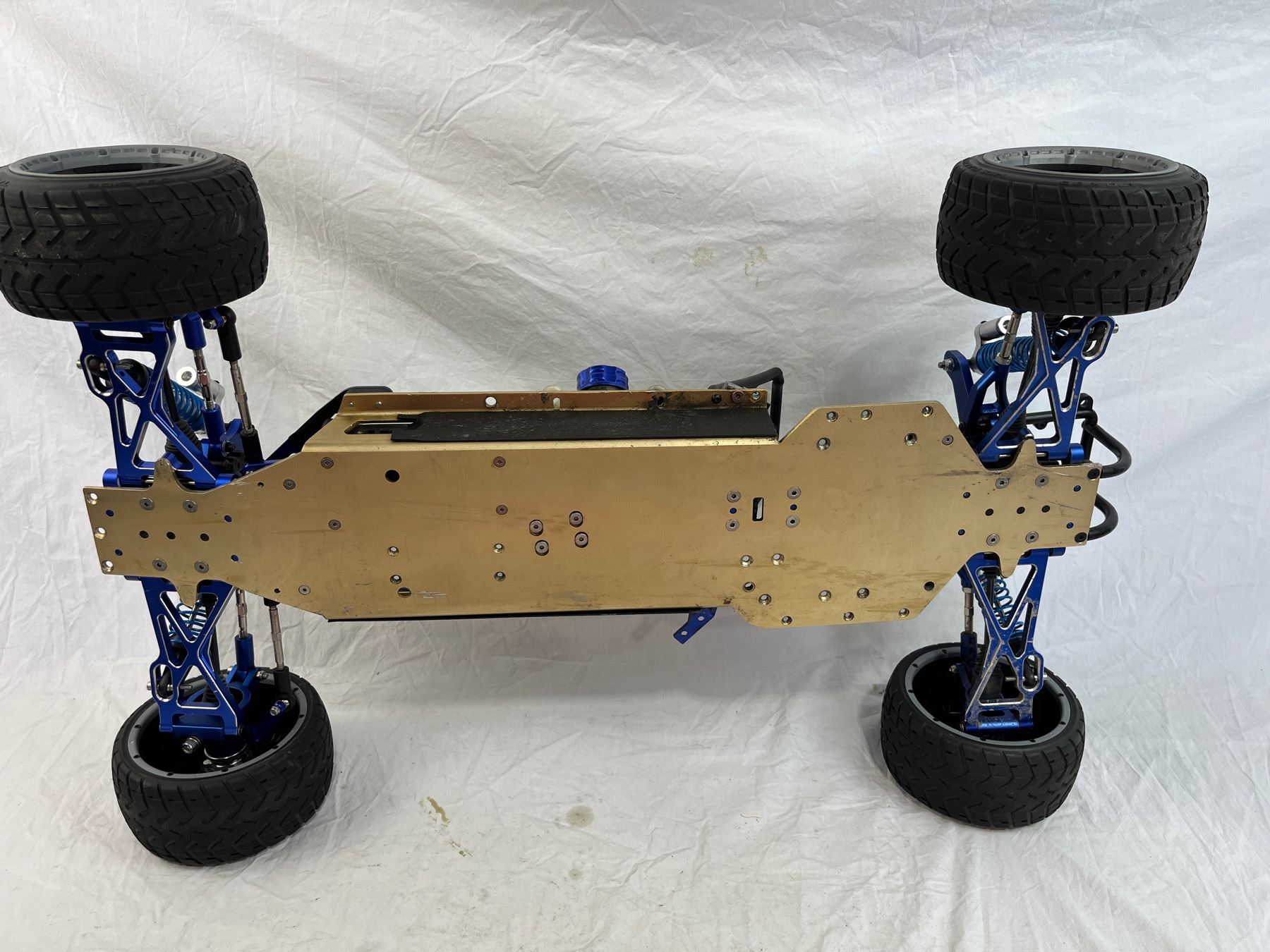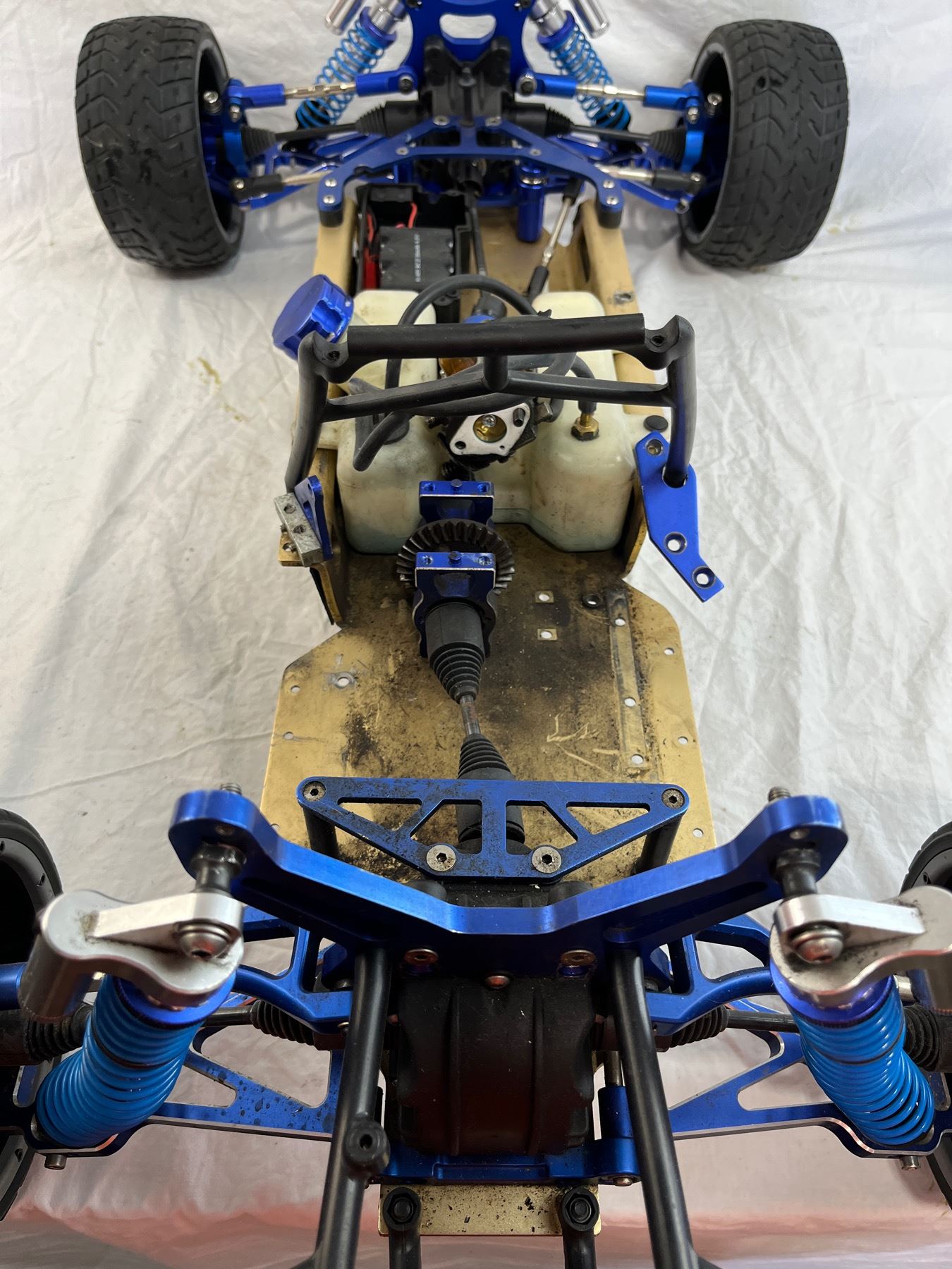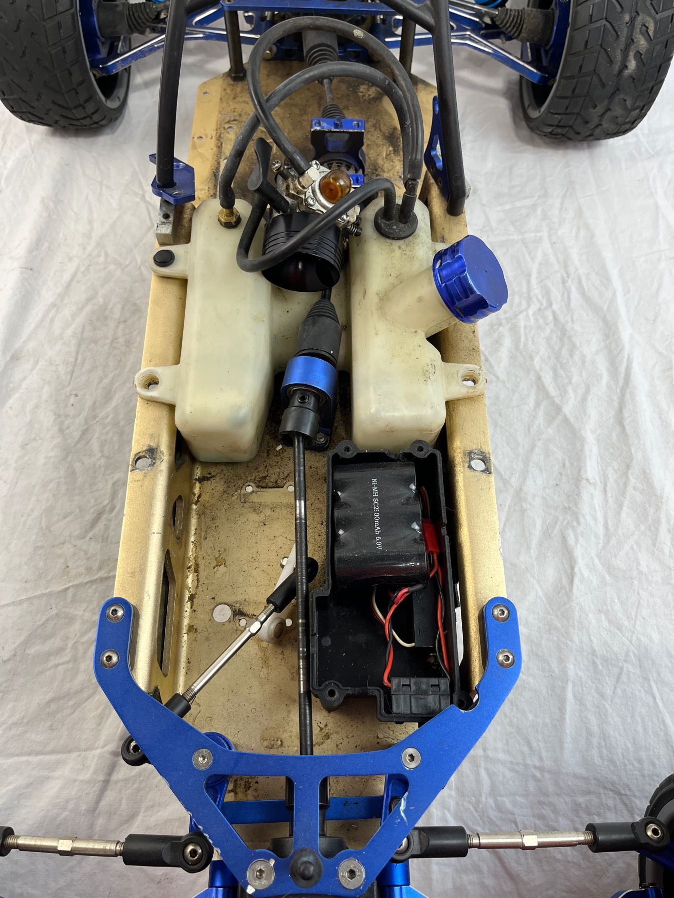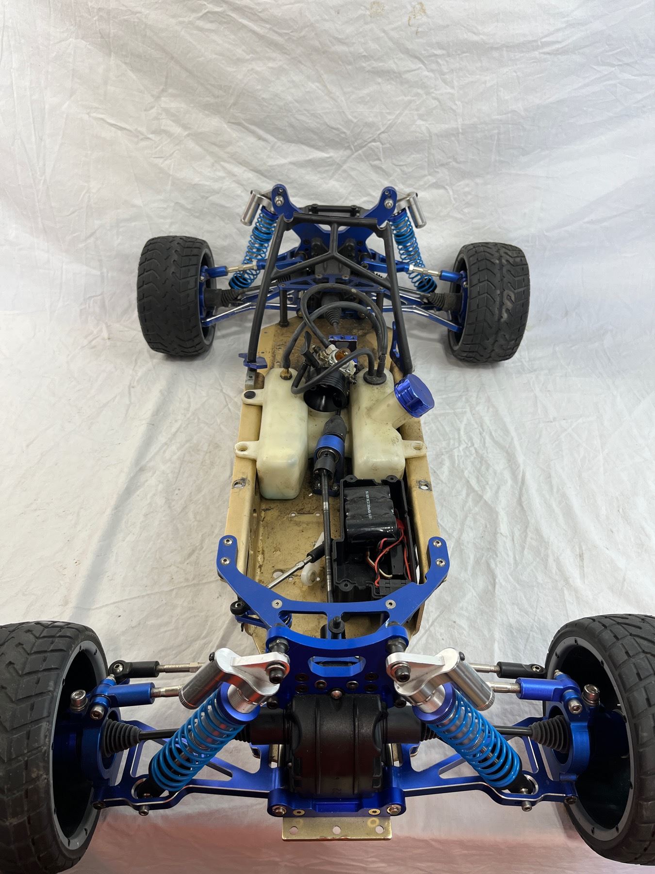 Large Gasoline powered RC Car measuring 32" long and 20" wide. Comes with various parts and components in box.