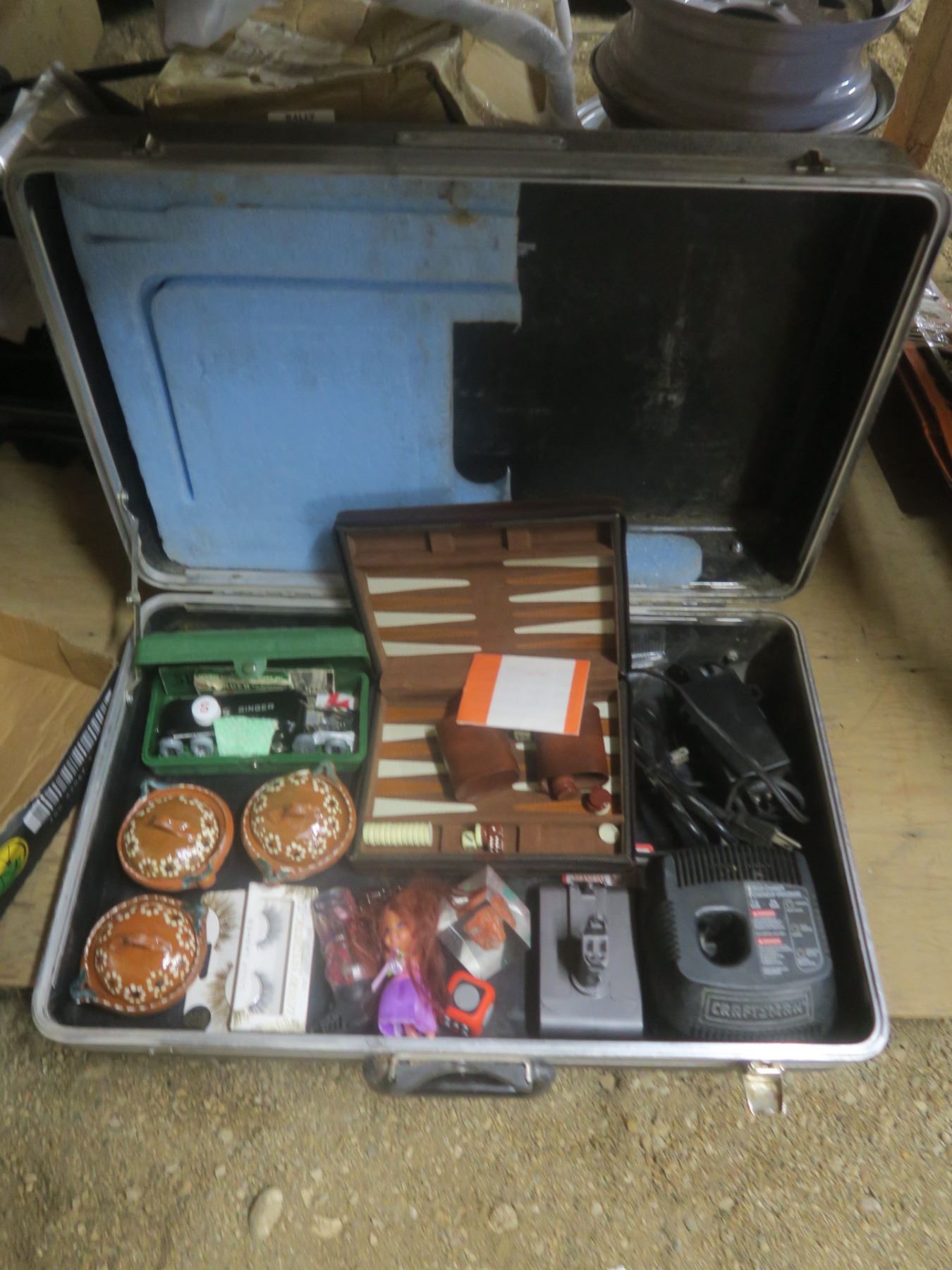 plastic case with a Singer buttonholer, misc. chargers, Dyson battery, backgammon, décor items, etc.
