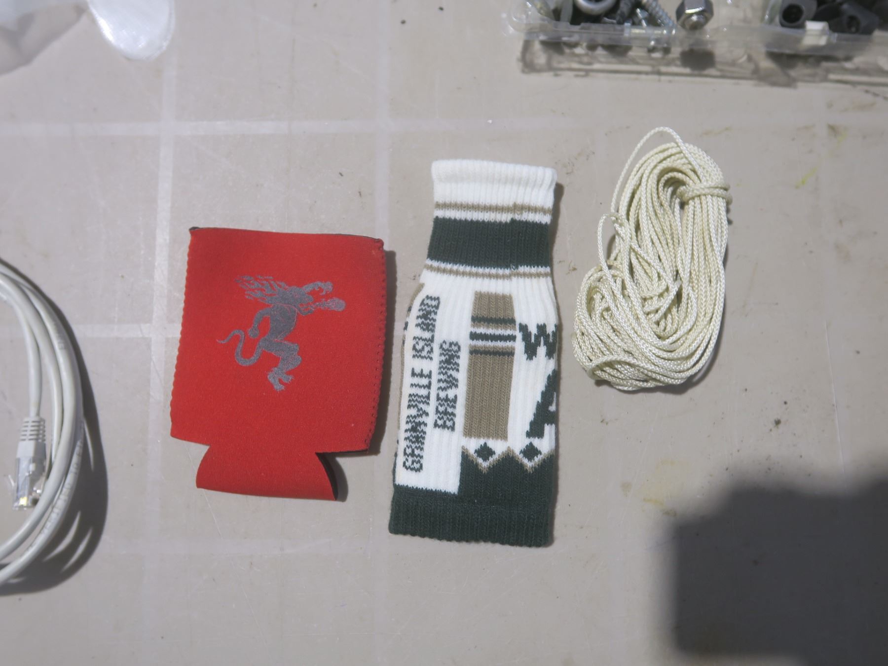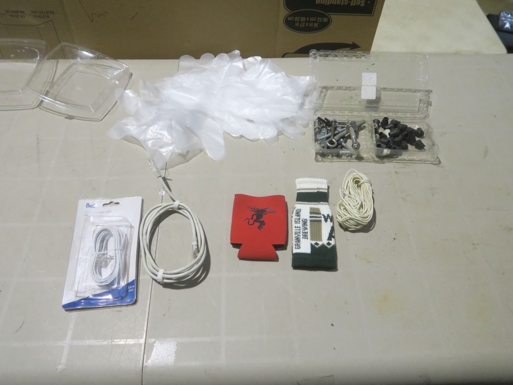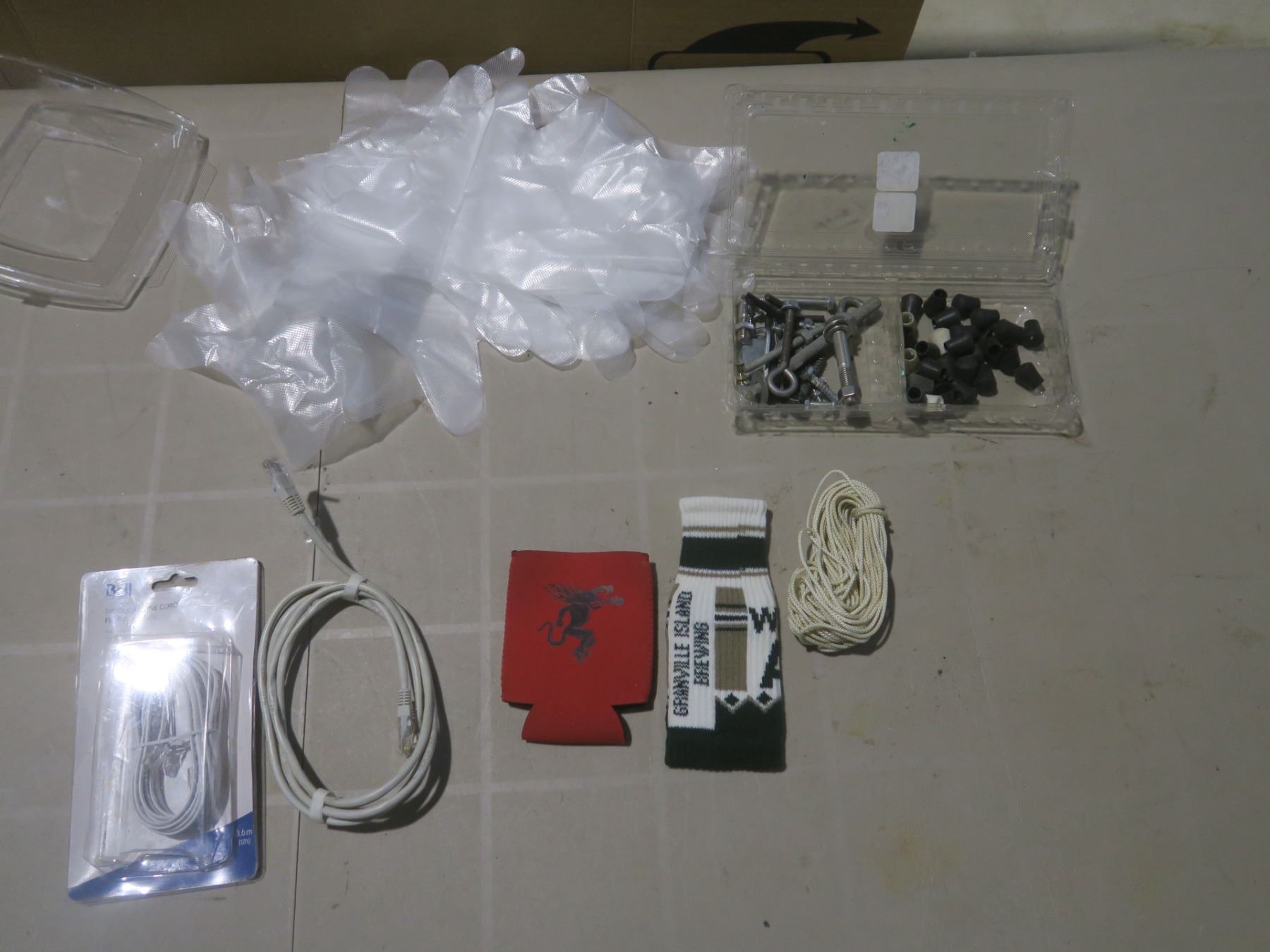 plastic gloves, 34' string, 2 ethernet cables, beer holders, assorted small tools