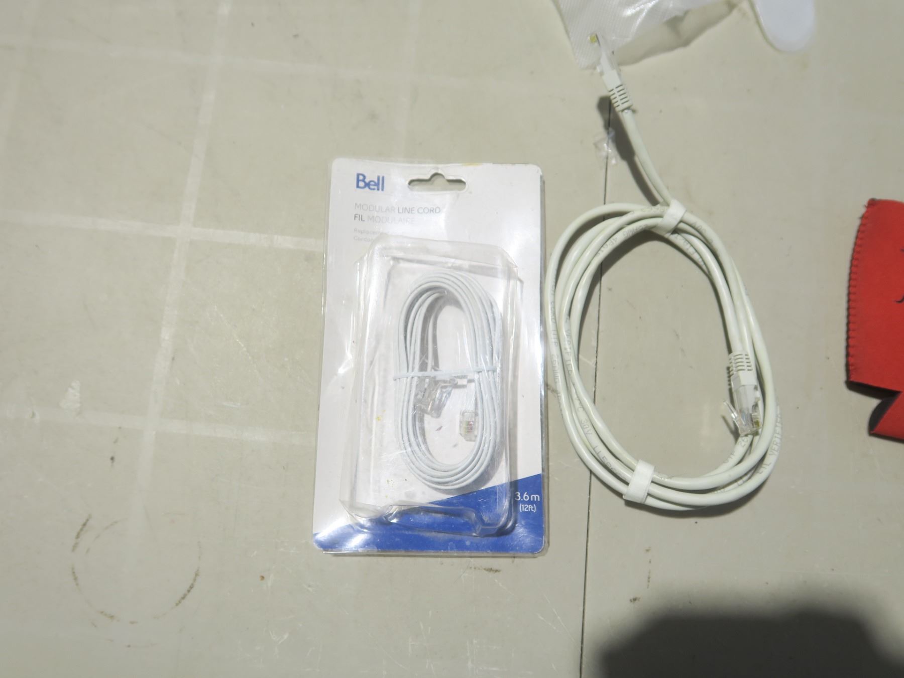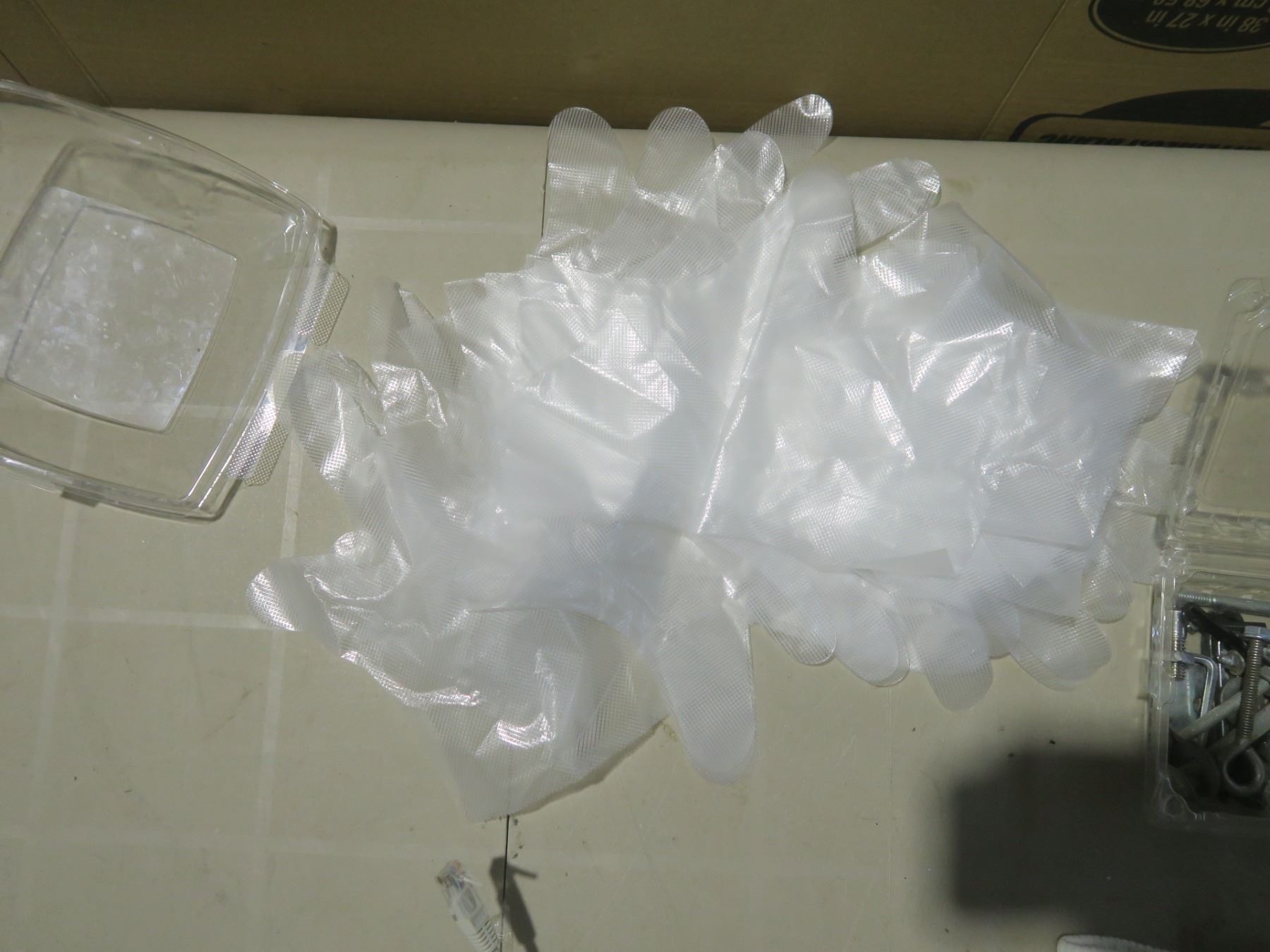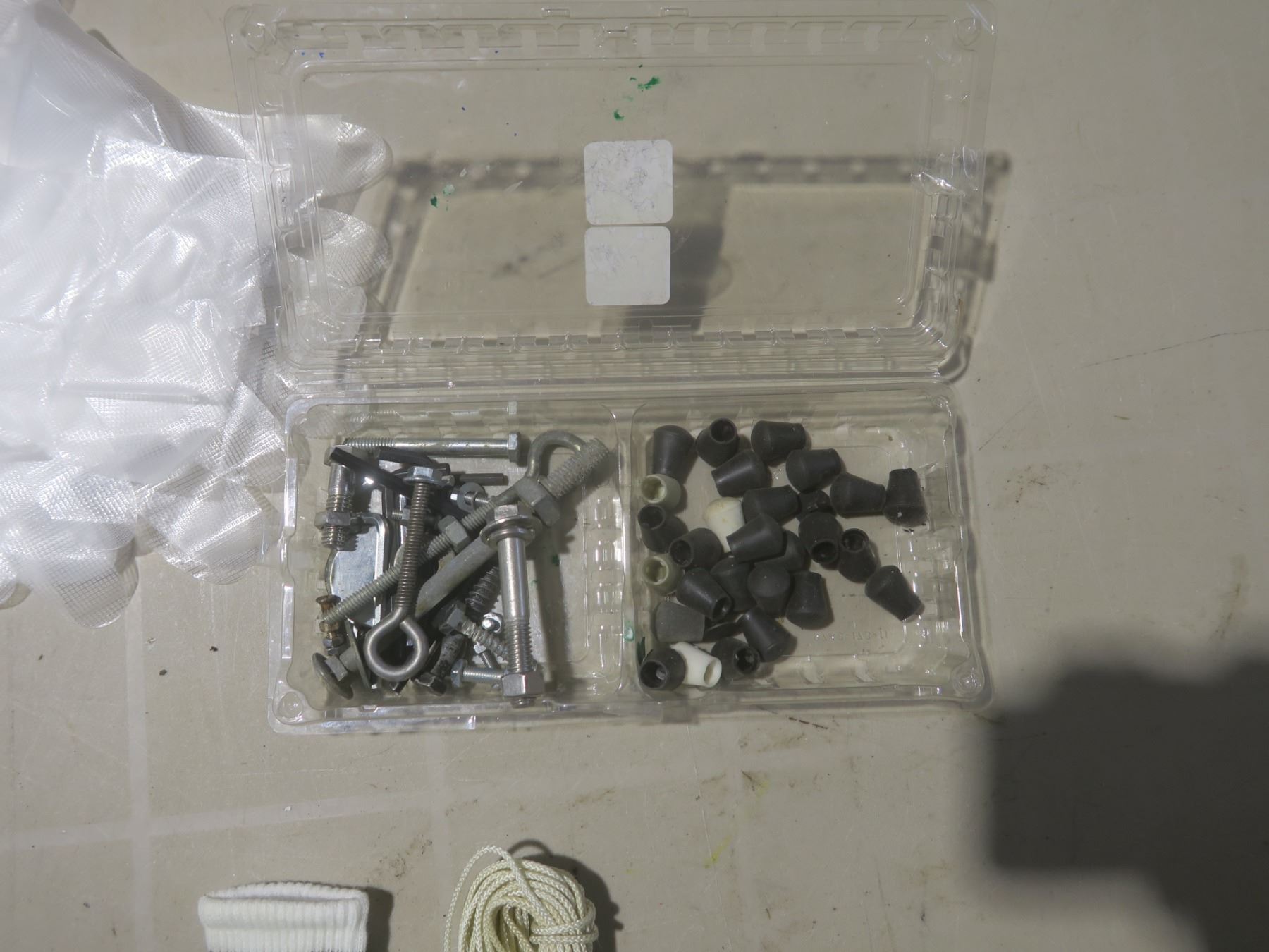 plastic gloves, 34' string, 2 ethernet cables, beer holders, assorted small tools