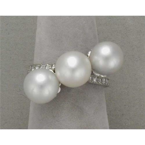Gorgeous platinum, diamond and cultured pearl ring. The cultured pearls measure approximately 8MM each, the twelve single cut diamonds are estimated to weigh a total of .18 carat. The inside is marked "10% irid-platinum, PEACOCK" It is a size 7 and weighs 7.7 grams.