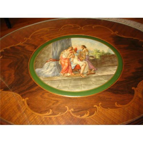 Awe inspiring. Vainy was an artist during the Russian Revolution and the stunning exquiste porcelain signed and painted by him is of three muses sugesting he could have painted it prior to the Russian Revolution. The rich walnut wood comprising the coffeee table has lush multi-wood inlaid top that just adds to the richness of this remarkable piece. The details of the signed porcelain measuring 12 x 10 by Vainy just add to the value and this majestic piece of furniture.