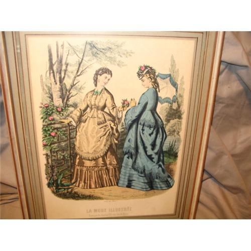 In the days before TV and movies...people during the 1850's had the magazine La Mode Illustree from Paris to see what the current fashion trends of the Victorian era were. This print is just lovely with detail of womans fashion. The prints for the magazine were hand colored and published on a weekly basis. You can see from the back of the frame, the print has been in this frame for years. Truely a great print of women's fashions depicting a time gone by.