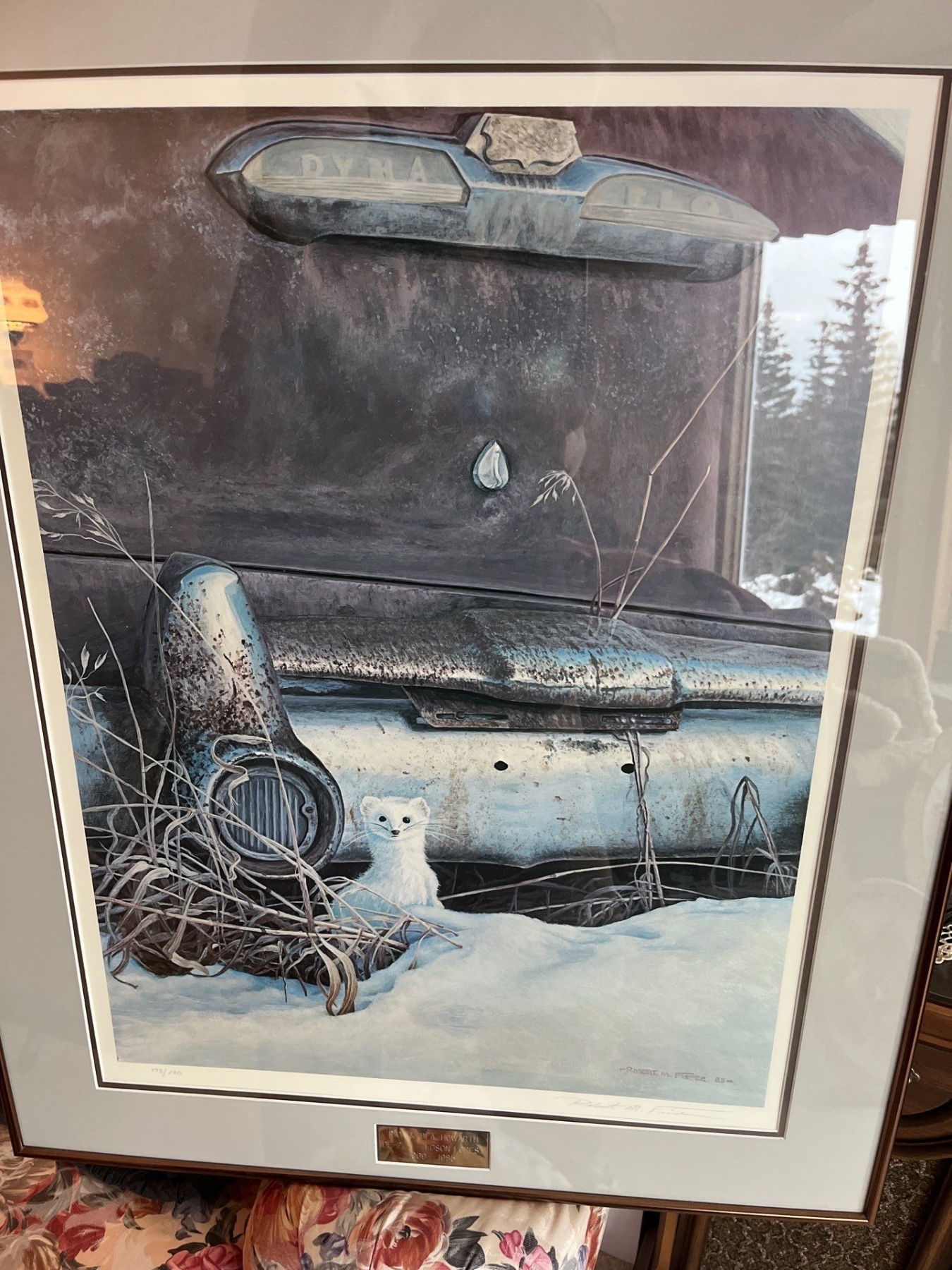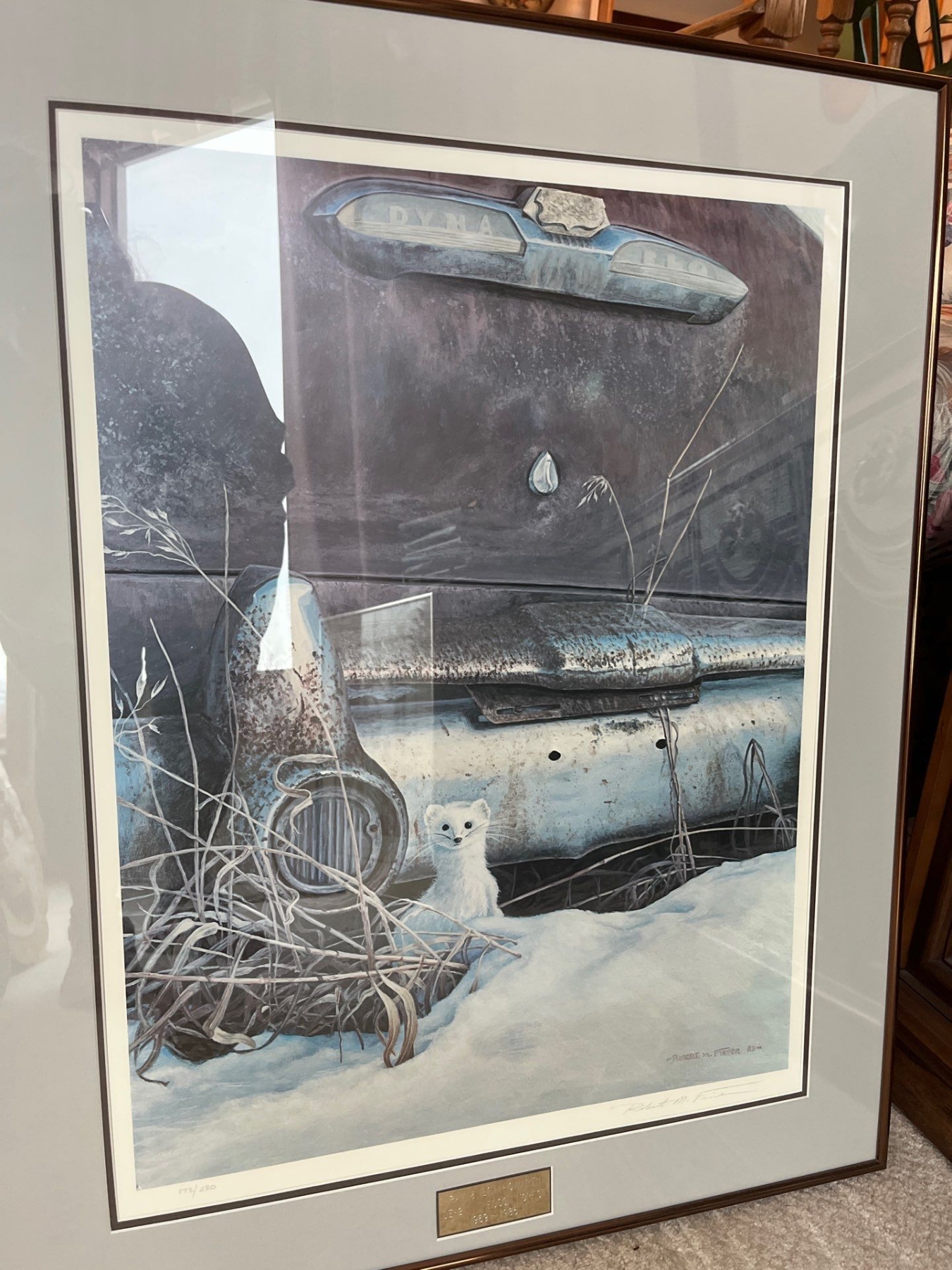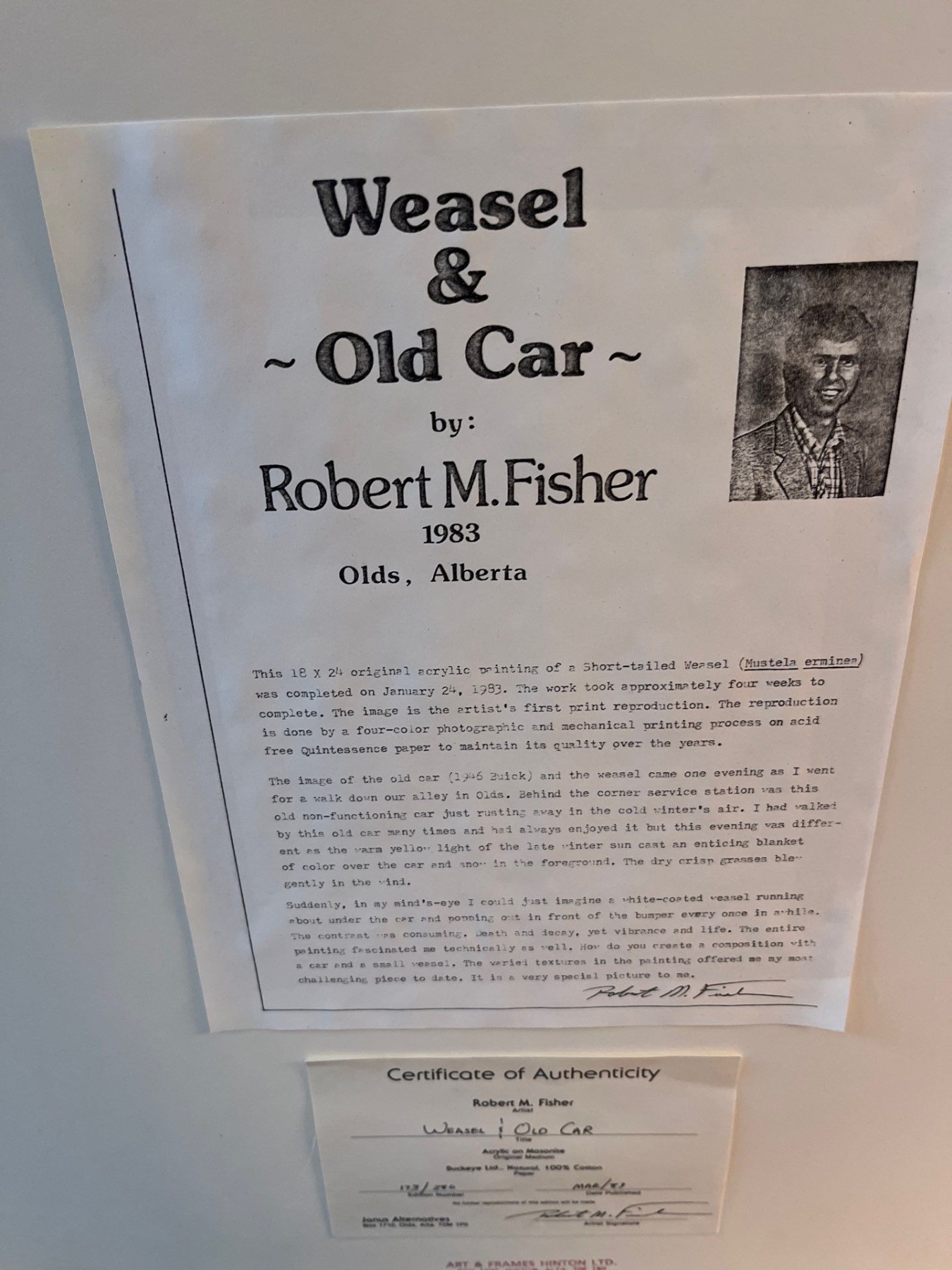 print by Robert M Fisher, 1983 Olds, Alberta, titled weasel and old car hand signed by artist limited edition out of 250.