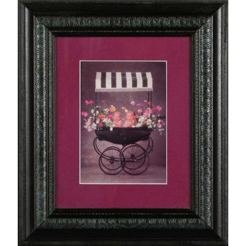 The flowers in the buggy cradle the babies in the print entitled ?Infant Twins?. This skillfully rendered piece is surrounded by an outstanding decorative black wood frame, and is bordered by a burgundy mat that matches the vivid colors of this fascinating work. The frame and print measures a total of 13.5?x 11.5?. This picture would be a great addition to any art enthusiast?s collection and is remarkably priced.