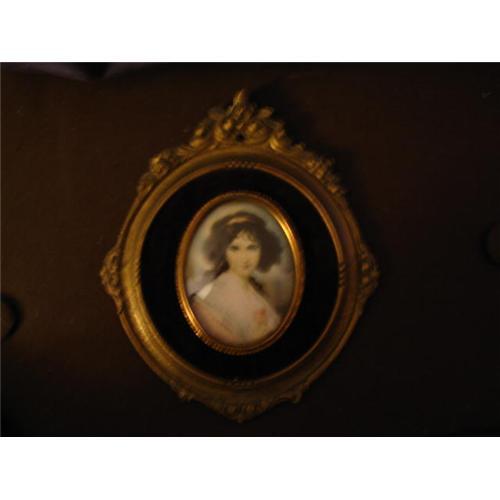 The ever so pretty "Hubak Lady" is the painting choosen by the accessory manufacture to feature in this reproduction. Back at the turn of the century there was a movement to copy famous artwork and produce them for the common middle classes. The accessory company highlighted this copy in an ornate frame and matted the background in rich velvet. On the back of the frame is an old yellowish label by the company that states, "Hubak Lady". This item showcases 2 historic times, the first is when the original was painted (and it looks to be by the famous British artist Thomas Lawrence) and the second when the movement was going strong to give the middle classes in the US their own masterpieces...the only way possible by a knock off-a copy. This is an excellent example of this movement and the woman is pretty as a picture.