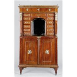 osztrák, 19. sz. közepe, tölgyfa alapon mahagóni borítással, eredeti öntött sárgaréz díszekkel, lehajtható írólapja mögött 13 fiókkal és tükrös rekesszel, 138*80*50 cm
