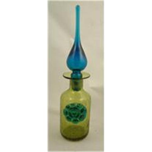 Outstanding crackle glass decanter made by the Rainbow Glass Company of West Virginia. Circa 1950's. It has a large blue tear-drop stopper that is asctually taller than the decanter itself. Rainbow was known for making taller stoppers. This decanter is absolutely gorgeous, and it has a matching hand applied blue rossette. It is 13" tall. Absolutely no damage.