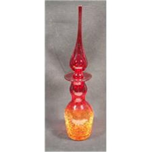 Outstanding amberina color crackle glass decanter made by the Rainbow Glass Company of West Virginia. Circa 1950's. It has a large ruby color tear-drop stopper that is asctually taller than the decanter itself. Rainbow was known for making taller stoppers. This decanter is absolutely gorgeous, and iit is 13 1/2" tall. Absolutely no damage.