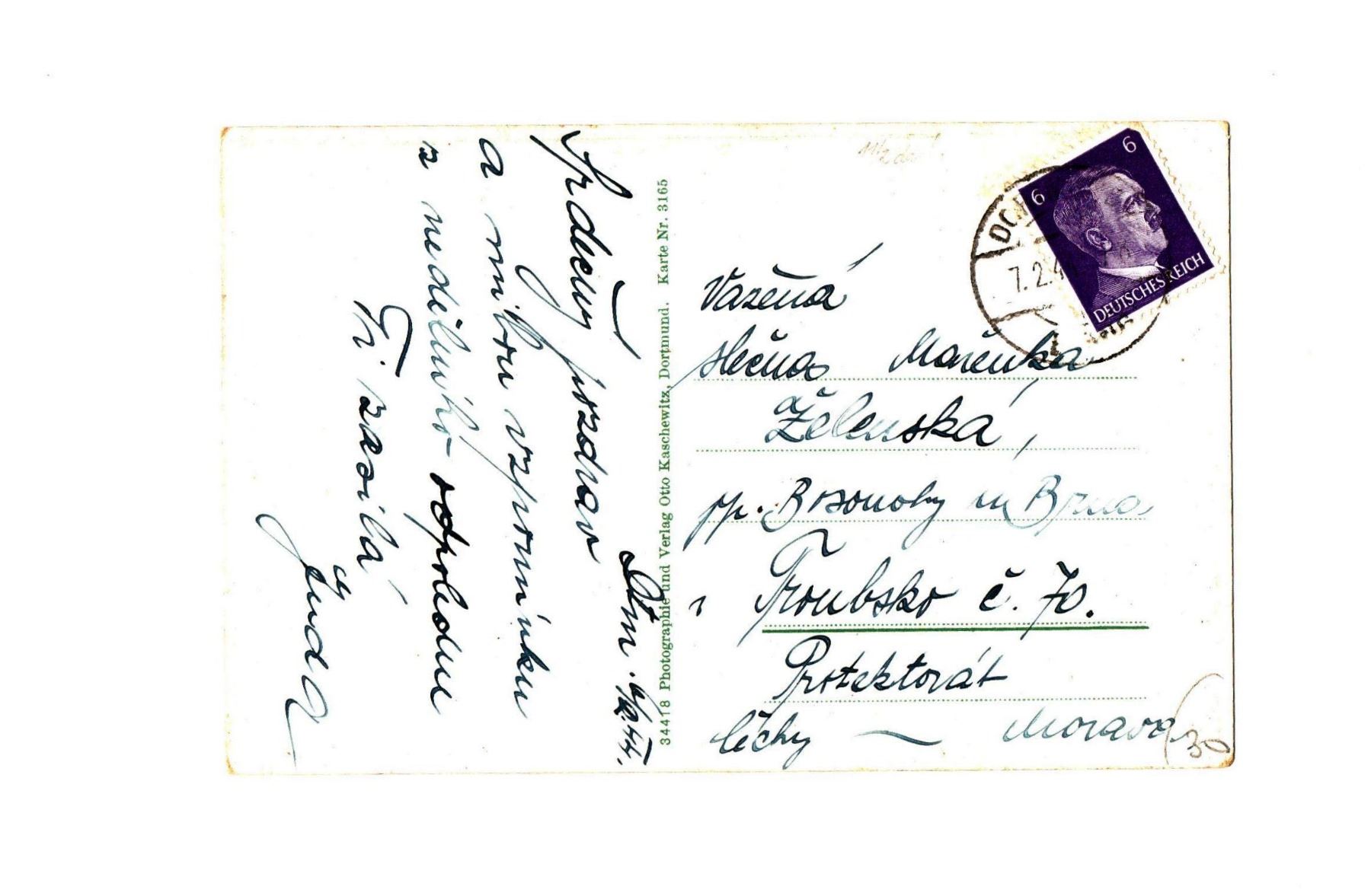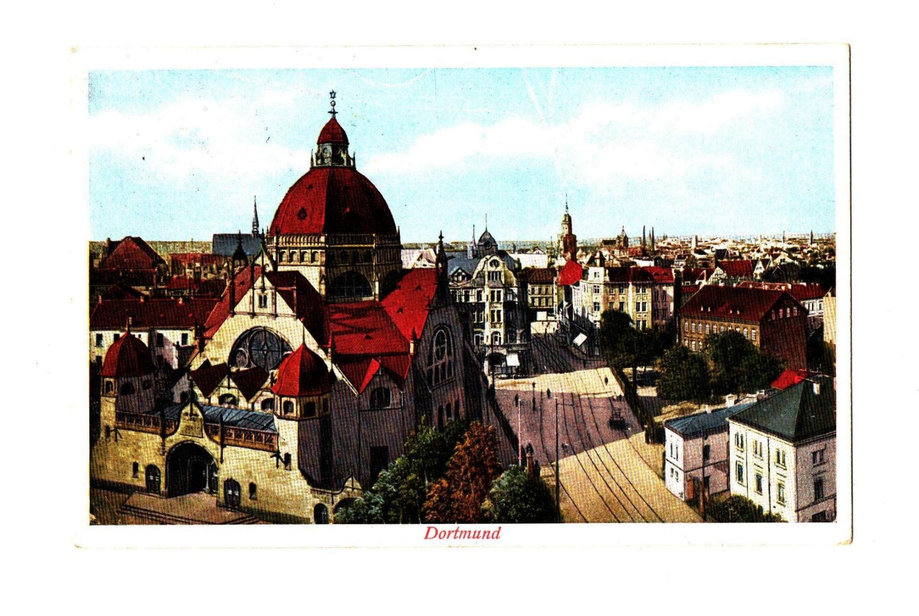 rare! Postcard of a synagogue in Dortmund that was sent during the Nazi regime in Germany, 7.2.1944. The Great Synagogue was burned down on Kristallnacht on 9.11.1938 and never restored thereafter. The postcard from the period of Nazi rule is rare because it was sent without return to the sender despite the appearance of the synagogue that stands out there. Postcard stamped and postmarked. In very good condition.