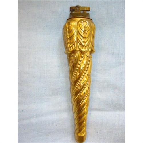 this rare vintage art deco lighter is very decorative and collectible with gold inlay on metal. the top pulls and under the lid, there is a place to put a gas in. however, i have not try to see how it works.this lighter is very interesting. it is in good condition, normal wear and tear with few scratches and imperfections.it reads japan on the very bottom side. it looks very nice. it measures 10 inches tall and on the top part 3 inches wide.