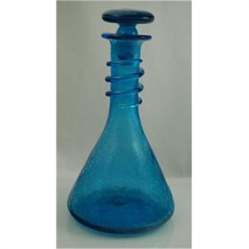 Beautiful Rainbow Glass Company crackle glass decanter from West Virginia, Ca. 1950's - 1960's. It is 10 3/4" tall to the top of the stopper. The original stopper is a solid mushroom-shape stopper. The decanter has very fine crackling. The neck has a snake-like hand-applied rigaree. There is no damage to the decanter. The entire decanter was hand blown. Sharp pontil mark on the bottom.